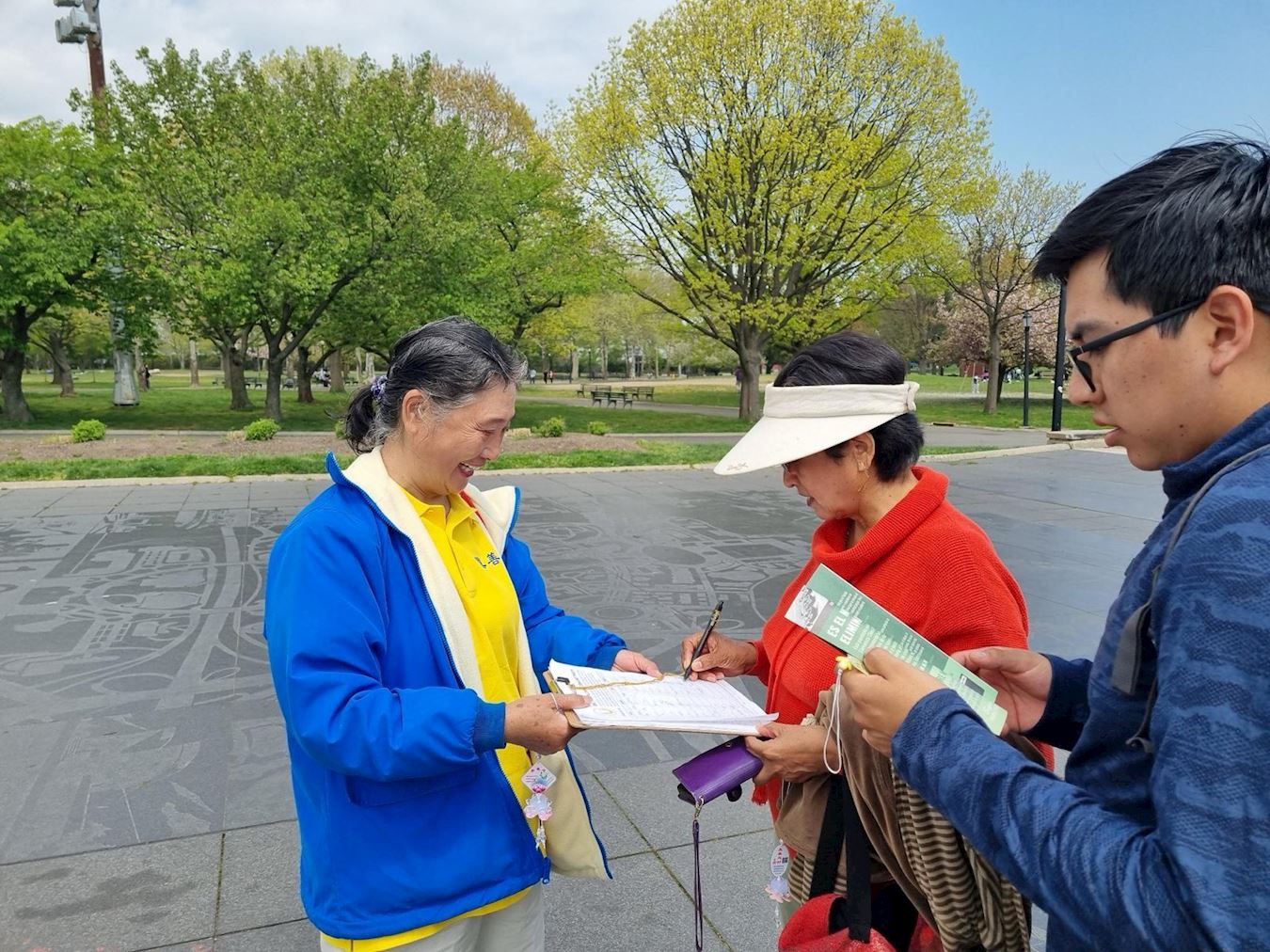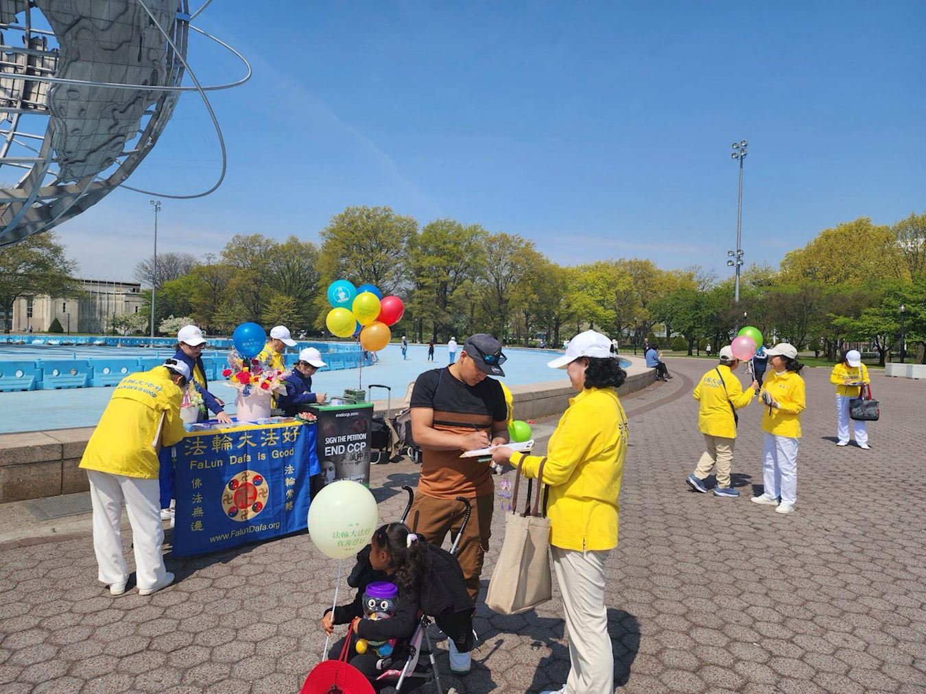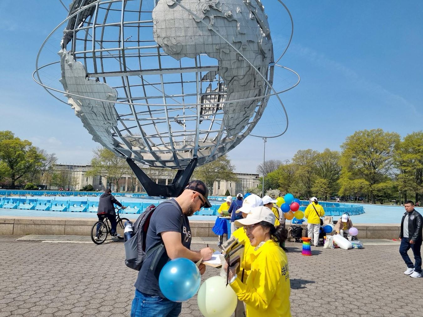 五月的一天,阳光灿烂,他们到纽约市王后区的地标——“法拉盛草原-可乐娜公园”的大地球仪那里,进行集体炼功弘法。这里游客络绎不绝,都看到了法轮功学员祥和的炼功场面,义工们并征签“打倒中共恶魔”(End CCP)的倡议书,人们纷纷签上自己的名字,表达支持。