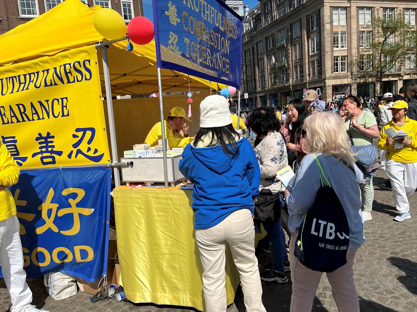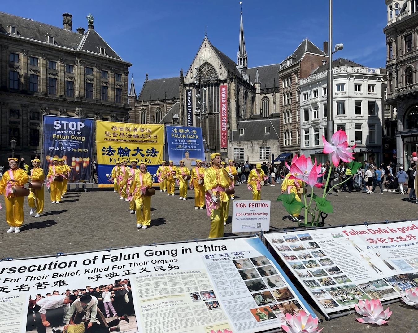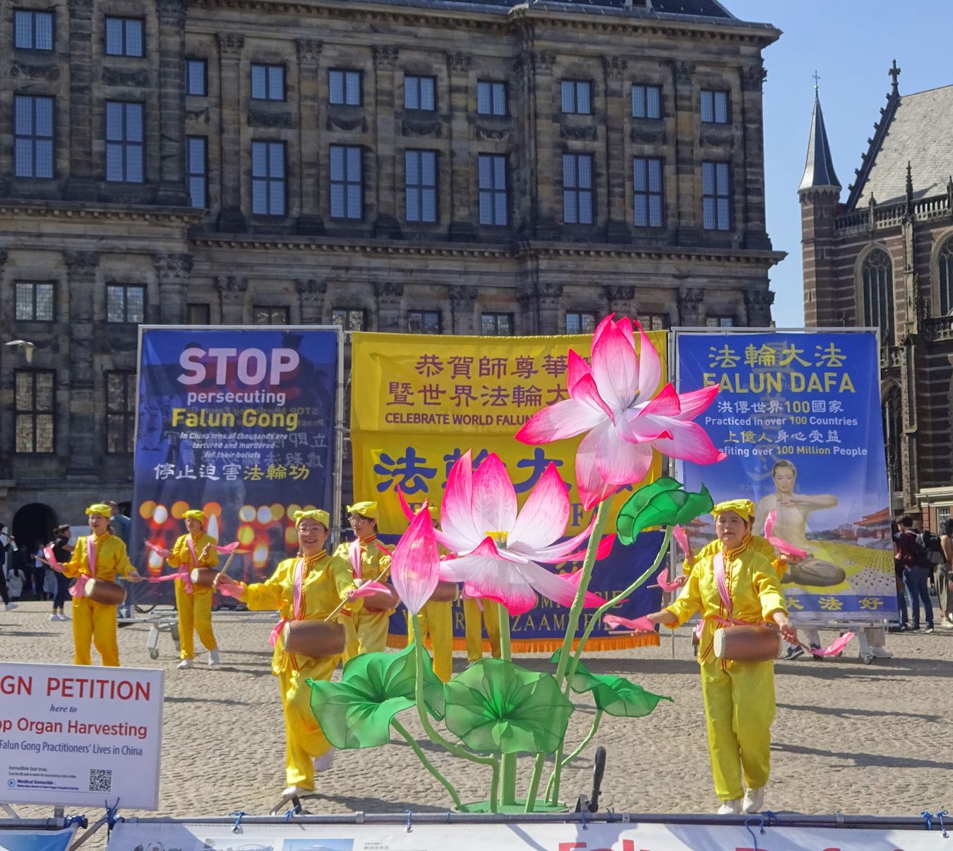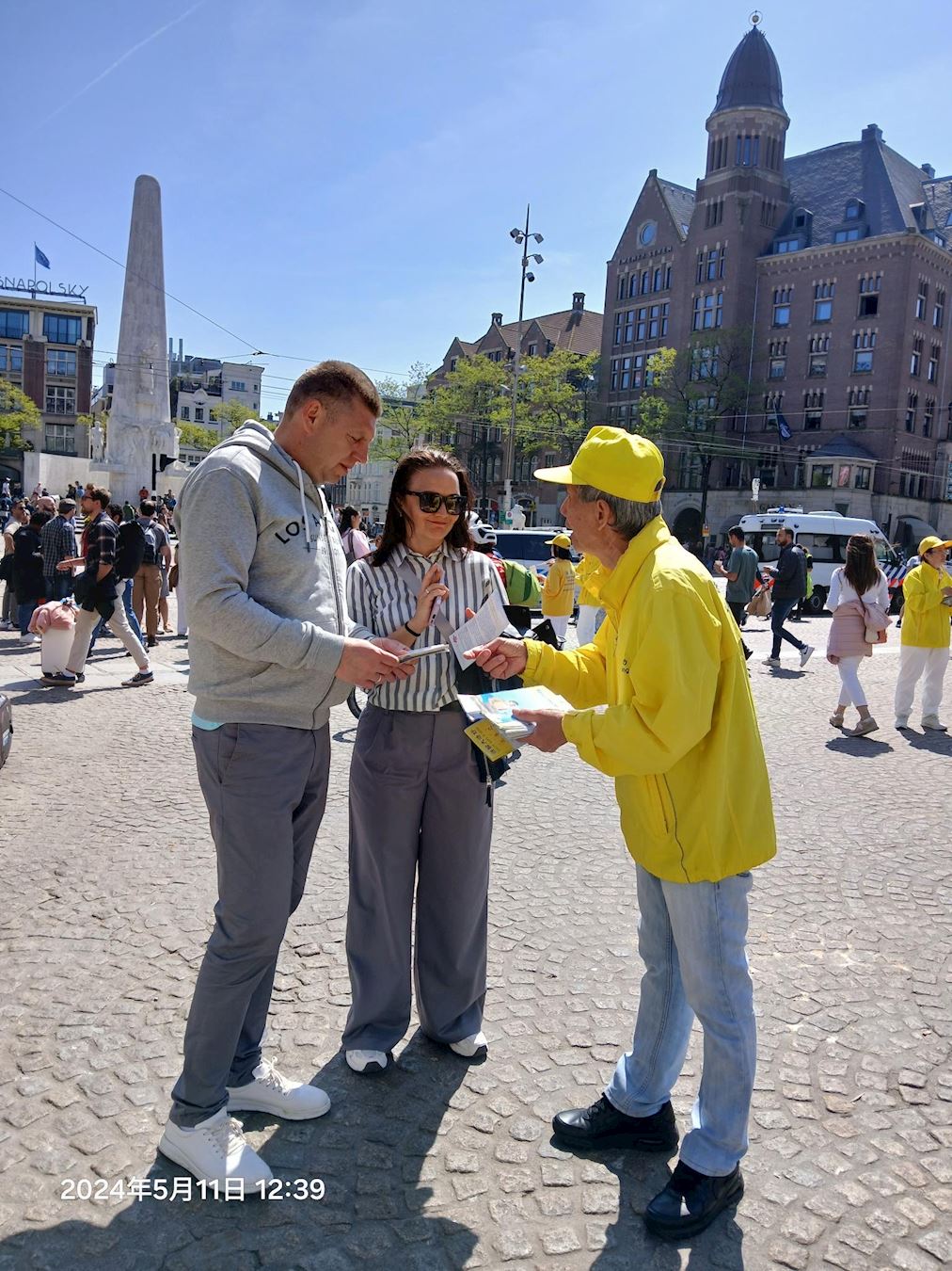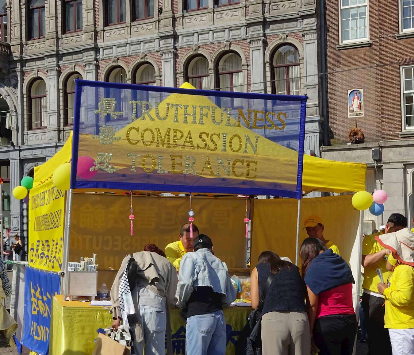 这一天,阳光明媚,天气晴好,部分荷兰法轮功学员早早来到水坝广场,竖起巨大的横幅,向往来游人展示这次活动的重大意义。