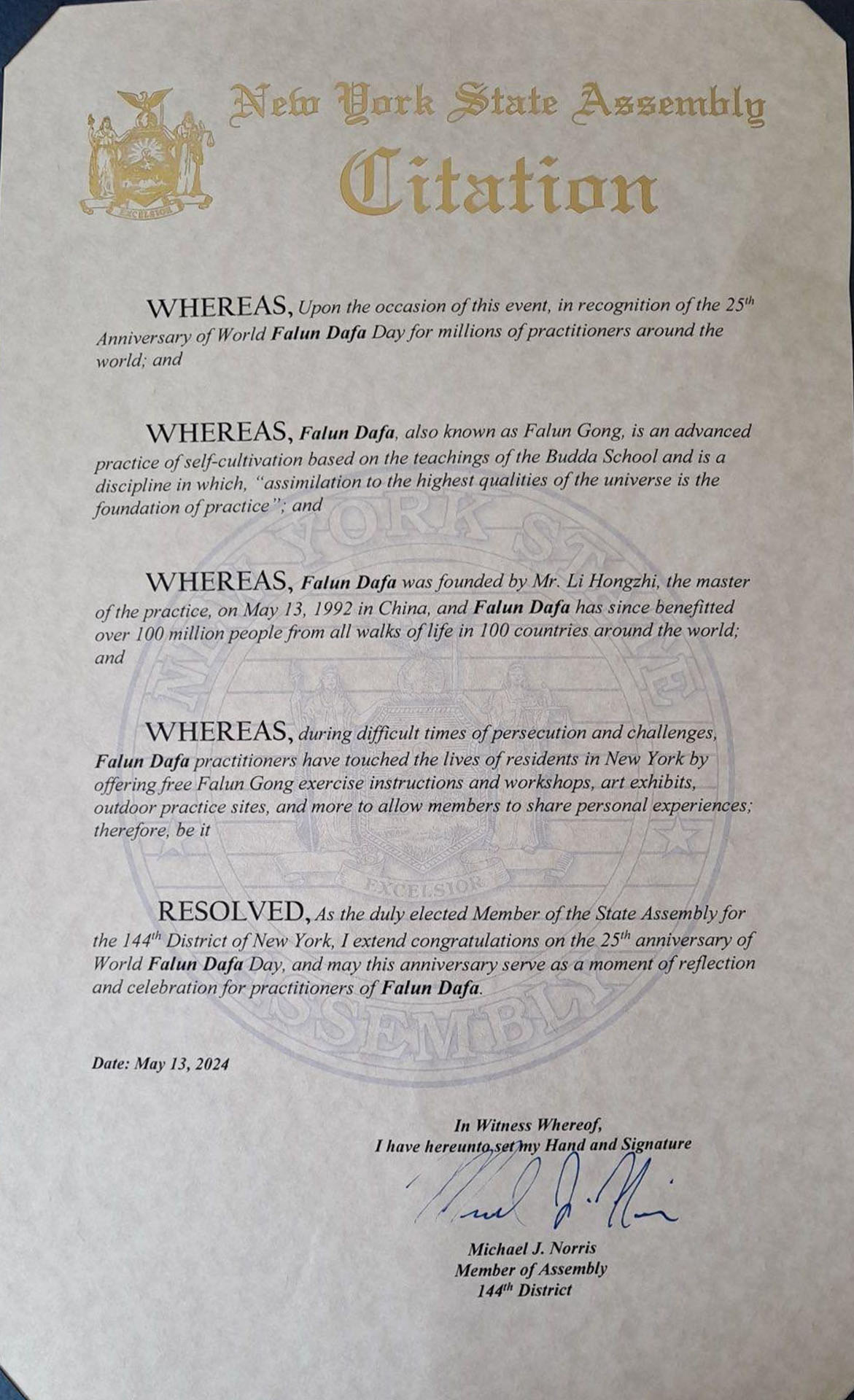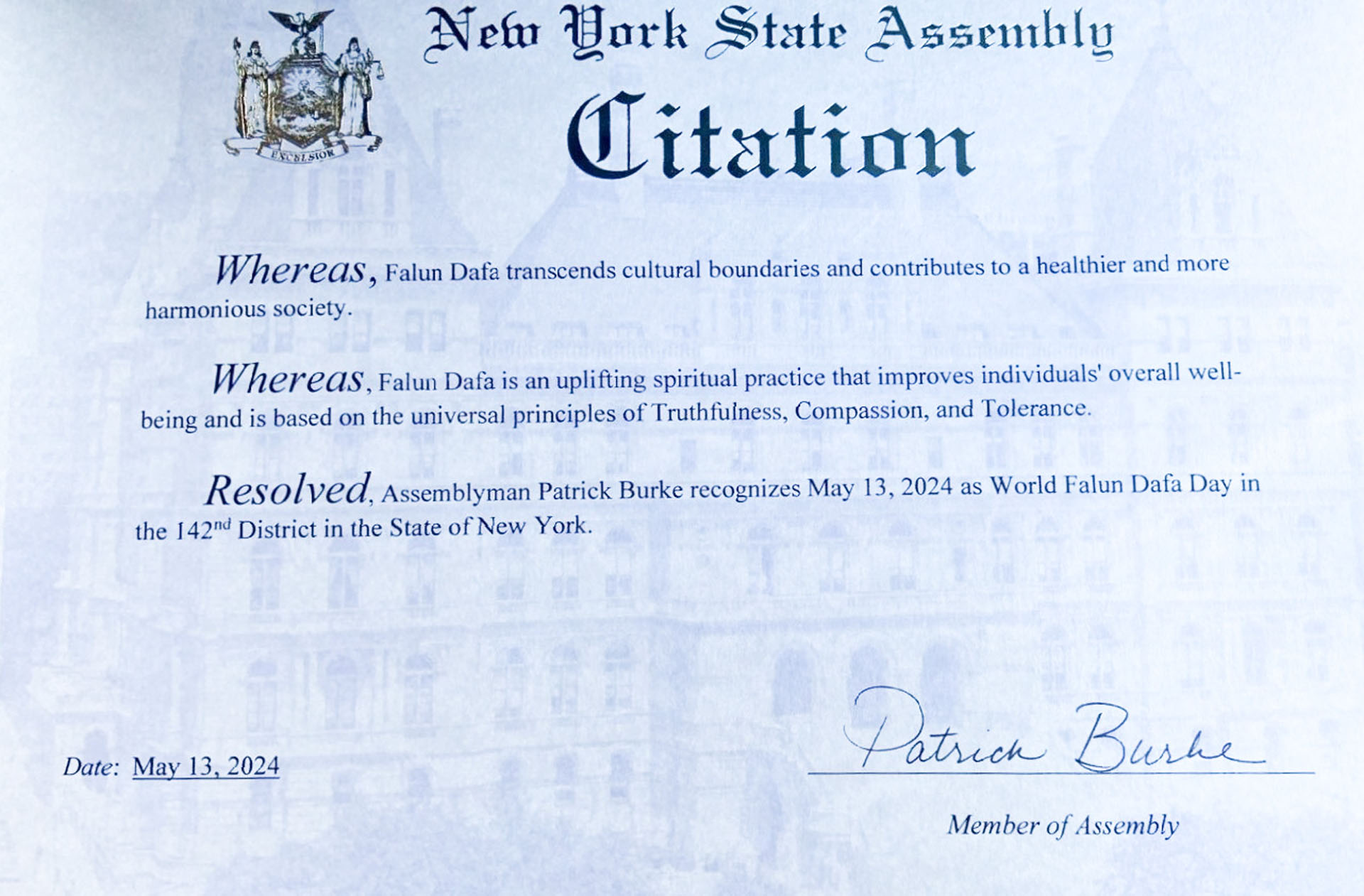 因此,议员帕特里克·伯克(Patrick Burke)宣布,二零二四年五月十三日为纽约州第142选区“世界法轮大法日”。