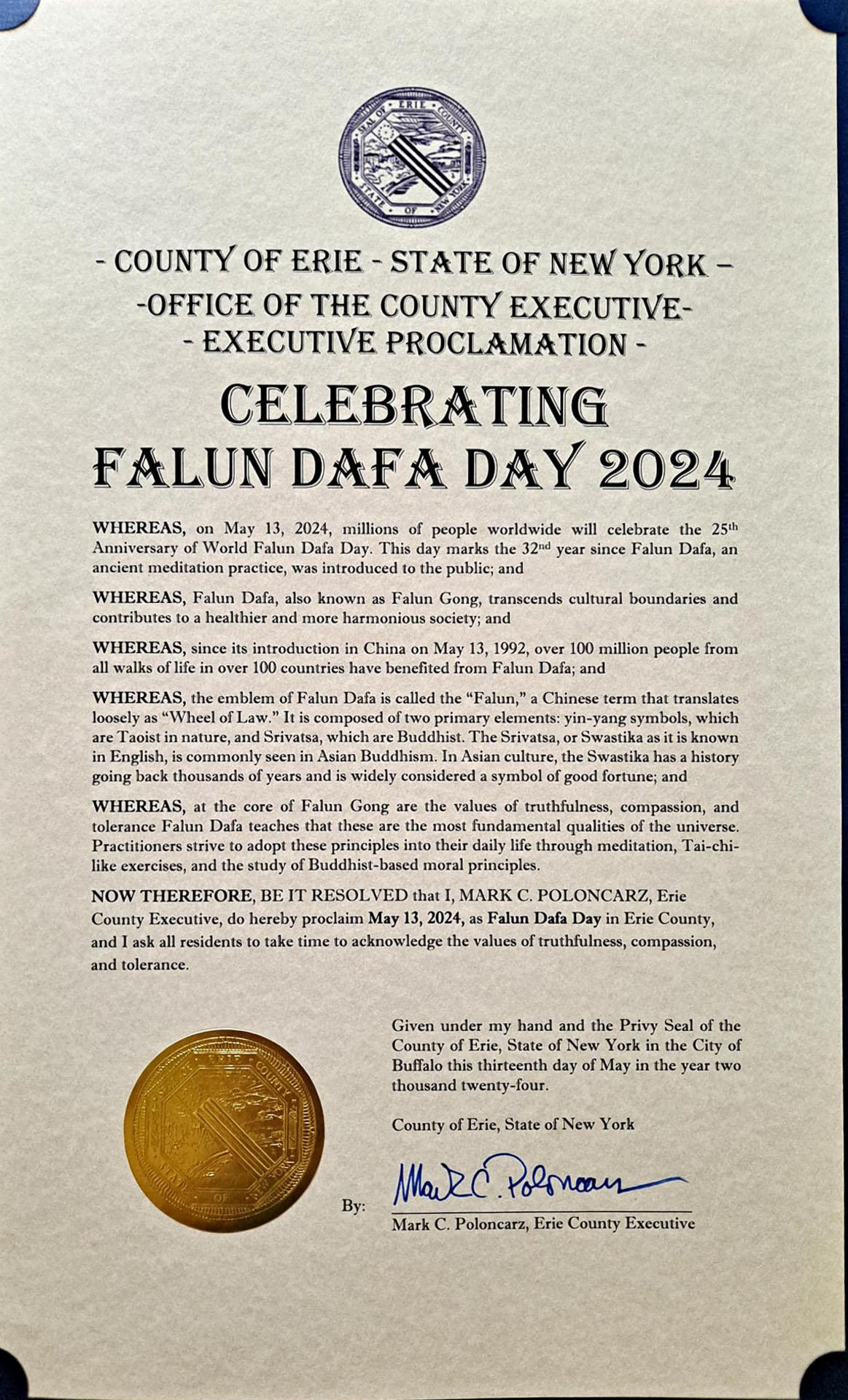 因此,现在,我,伊利县行政长官,马克·C·波隆卡尔兹(Mark C. Poloncarz)宣布,二零二四年五月十三日是伊利县的法轮大法日,希望所有居民认识真、善、忍的价值。
