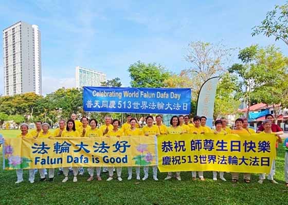 - 庆祝世界法轮大法日 马来西亚学员谢师恩- 五月十二日清晨,马来西亚北部槟城州和吉打州法轮功学员齐聚槟城州槟岛双溪里蒙休闲公园,欢庆“世界法轮大法日”。