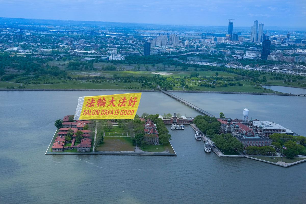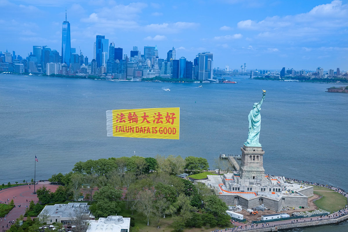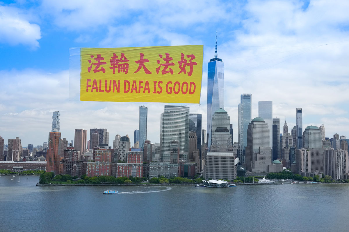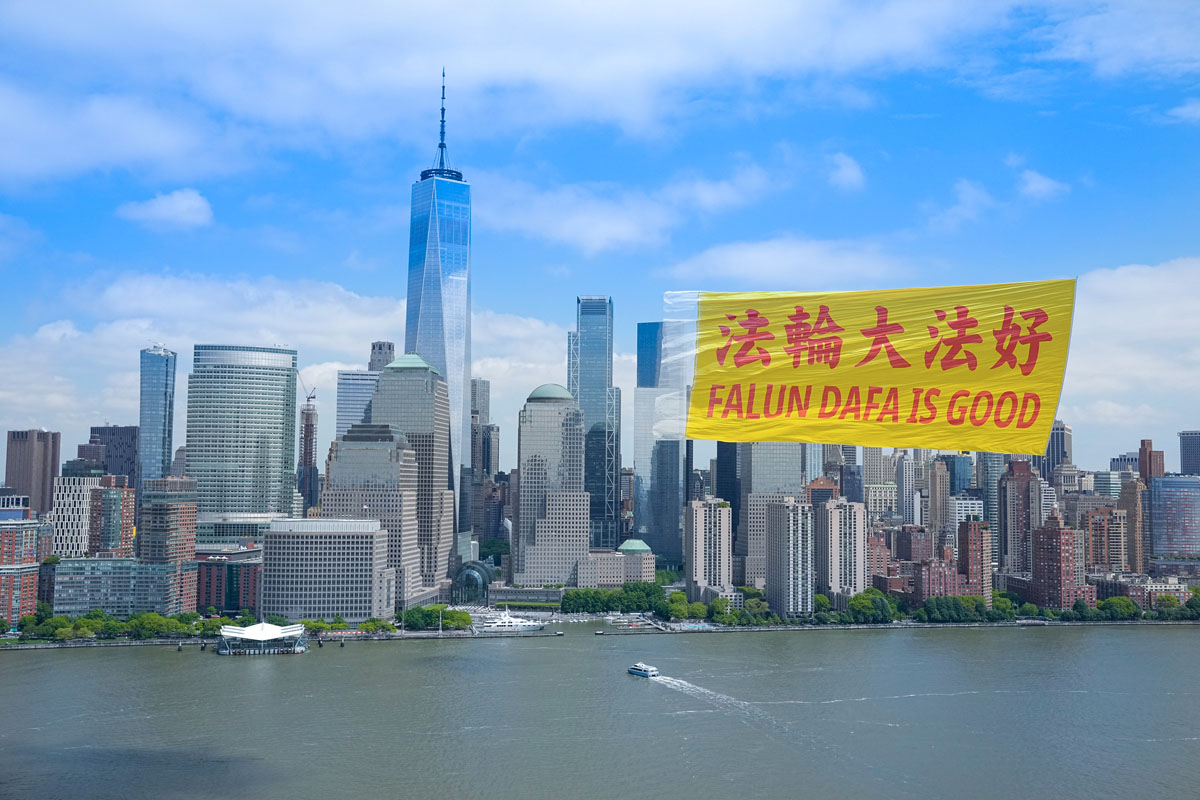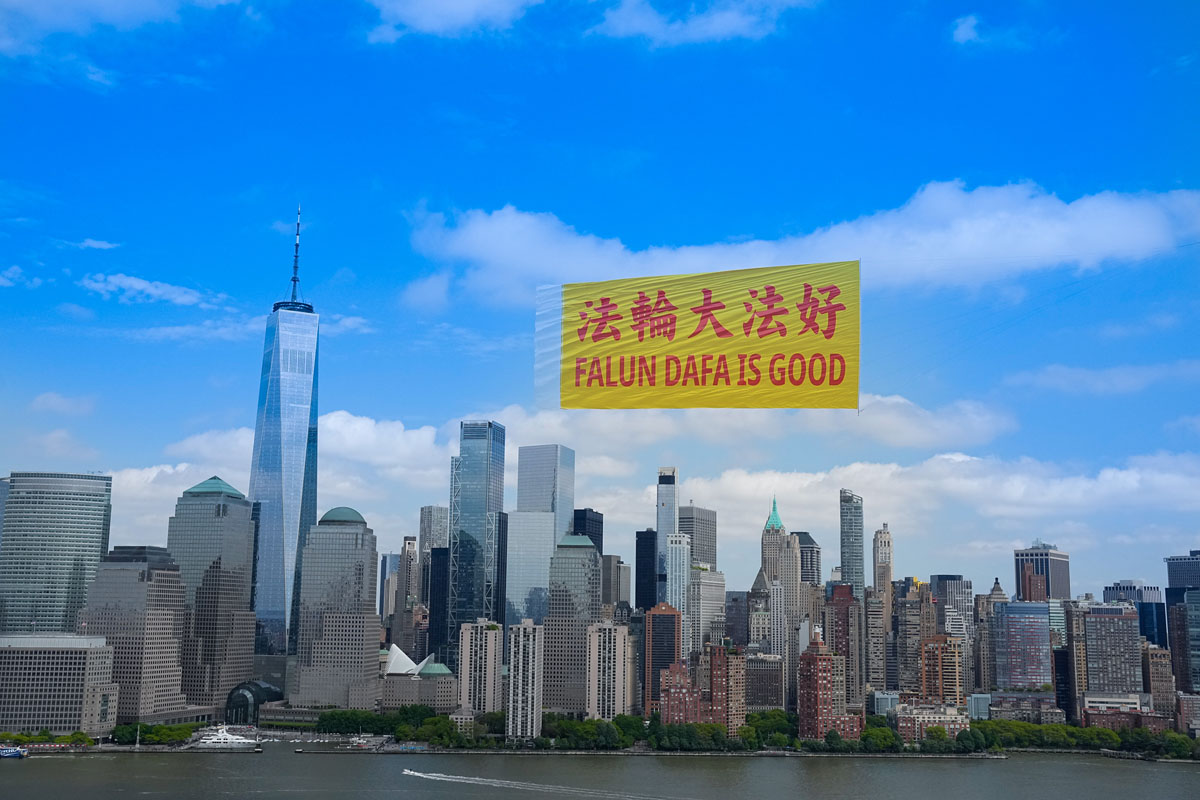 当天在纽约曼哈顿哈德逊河的上空,蓝天白云下,长80英尺、高40英尺,黄底红字的“法轮大法好”(FALUN DA IS GOOD)中英文巨型横幅,在天空中高高飞扬,背景为曼哈顿的高楼大厦,包括自由女神像、世界贸易中心、帝国大厦等许多著名地标,场景蔚为壮观。