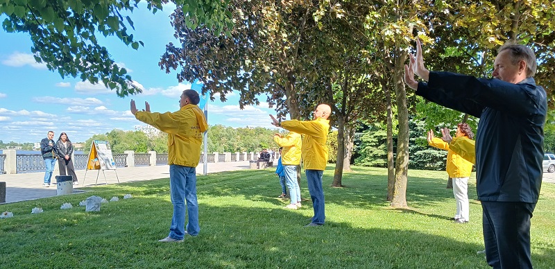 学员们展示了法轮功功法,并且发给路人法轮大法简介传单。他们还向感兴趣的人们提供更多了解法轮大法的网站链接,包括学炼功法和阅读大法书籍的网站。