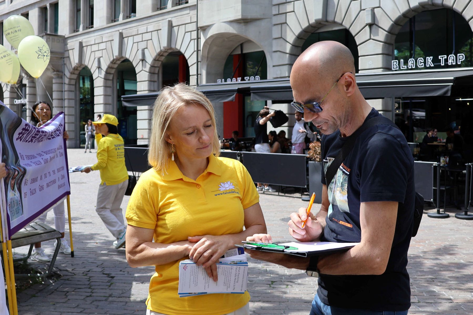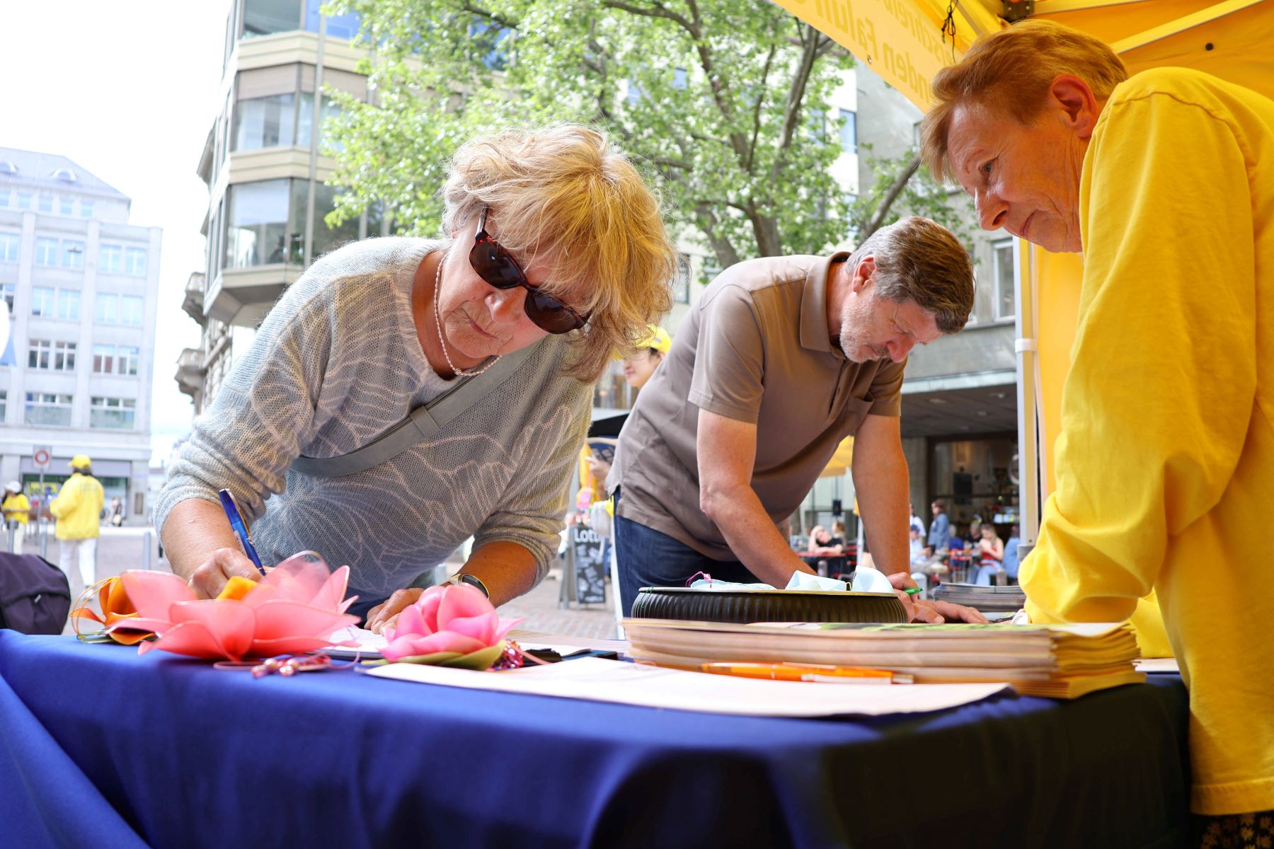 二十五年来,海外法轮功学员一直惦念着他们在中国的同伴。为了让在中国的法轮功学员们也能早日自由地庆祝法轮大法日,当天的活动中也设立了征签活动,请路人支持要求瑞士政府能伸出援手,共同制止中共迫害法轮功及活摘器官的罪刑。