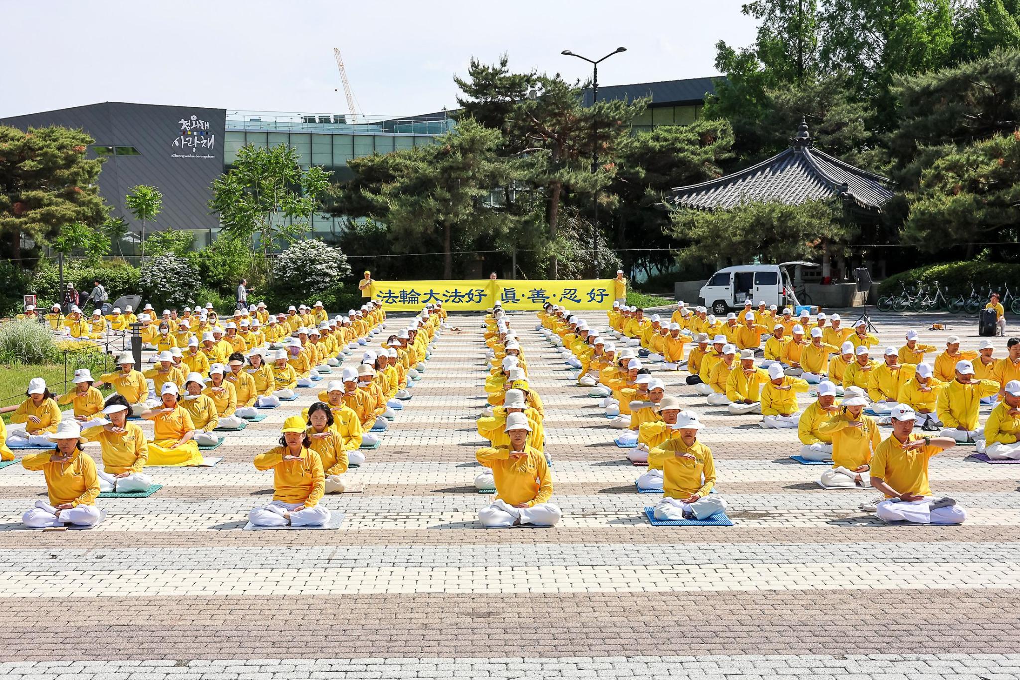 二零二四年神韵艺术团在韩国的演出圆满落幕后的第二天,暨五月十二日,法轮功学员心怀着对师尊的感恩聚集在青瓦台前,举行了庆祝世界法轮大法日及祝贺师尊华诞活动,然后随着祥和的炼功音乐集体炼功。