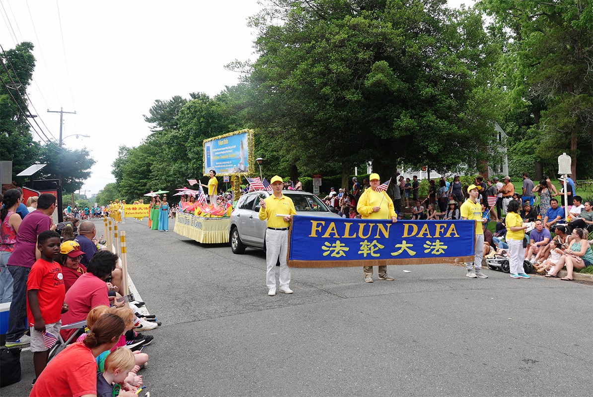 图1~5:二零二四年五月二十七日下午,大华府地区部份法轮功学员再次参加了华盛顿近郊弗吉尼亚州瀑布教堂市(Falls Church)的阵亡将士纪念日游行。图为:法轮功学员的游行队伍。