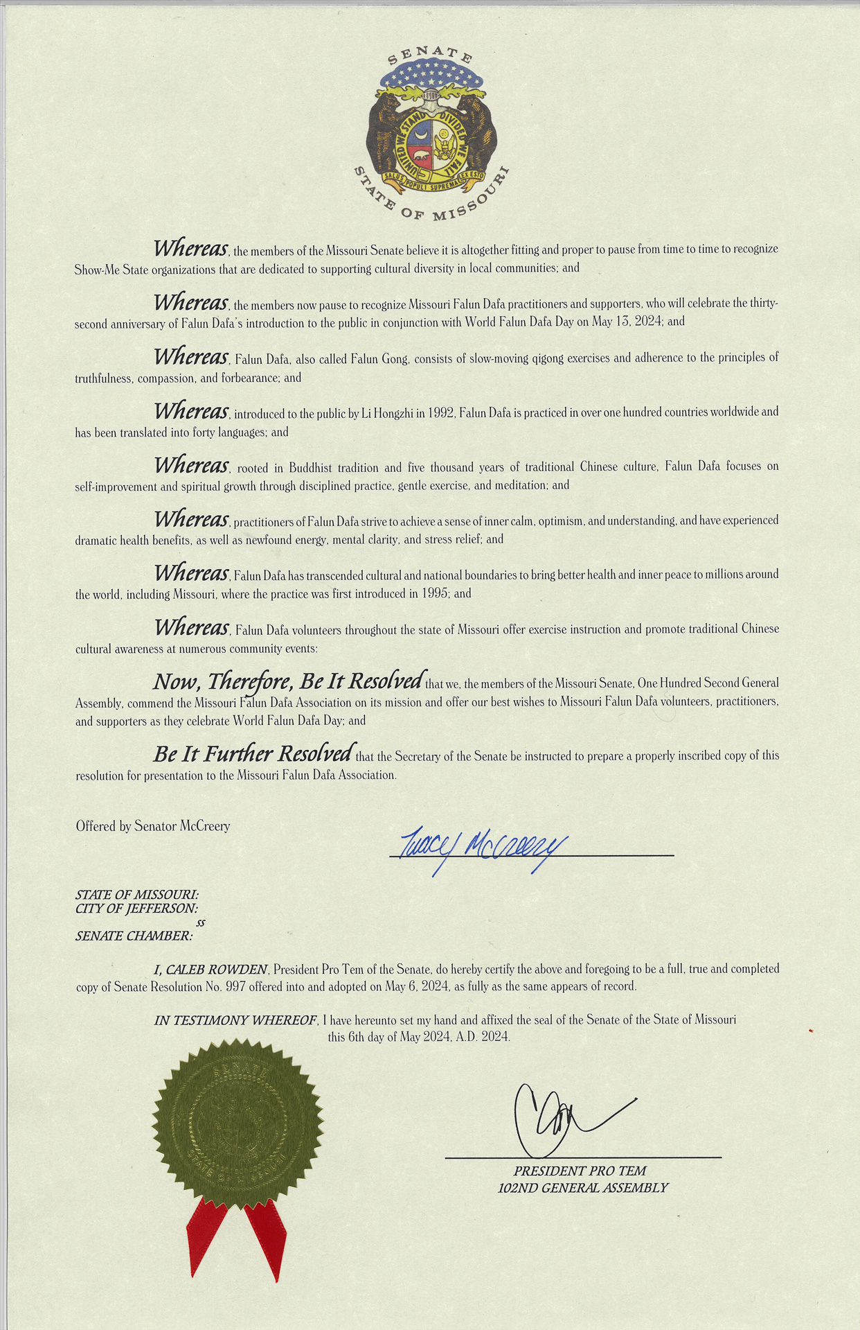 五月六日, 密苏里州参议院通过了第997号决议案,“法轮大法由创始人李洪志先生在一九九二年传出,在全世界一百多个国家都有人修炼,并且已经被翻译成四十多种语言;法轮大法传世之后,超越了文化及国家的界限,为全世界,包括密苏里州在内的数以百万计的人们带来了健康和内心的平静。”