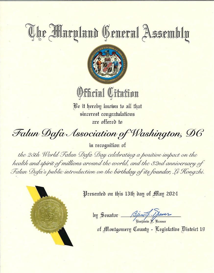 表彰第二十五届世界法轮大法日,庆祝大法给世界各地的数百万人的身心健康带来积极正面的影响,同时表彰法轮大法传世三十二周年,这一天也是法轮大法创始人李洪志先生的生日。