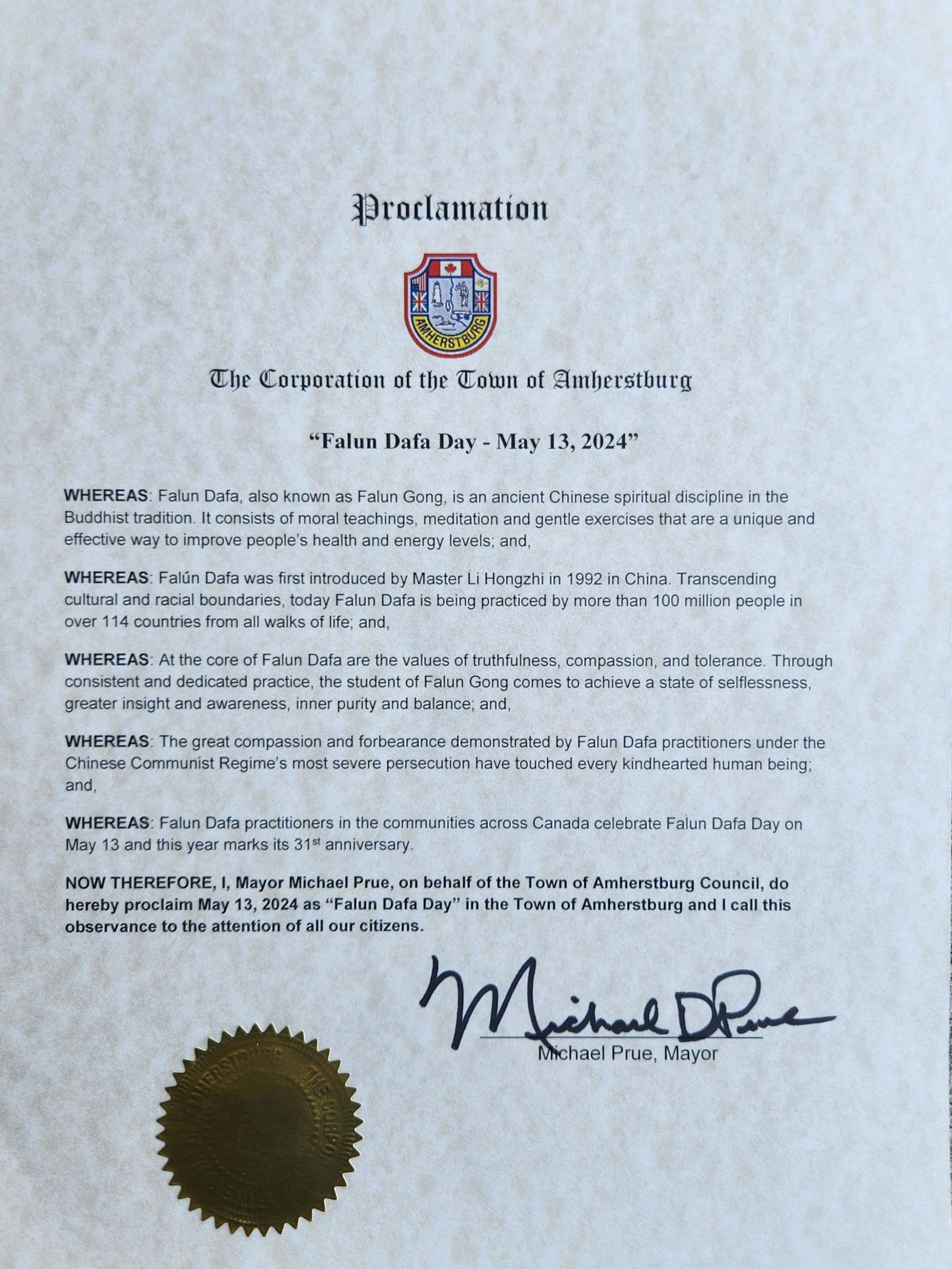 现在,在这里,我,迈克尔·普鲁市长,代表阿默斯特堡镇议会,特此宣布二零二四年五月十三日为阿默斯特堡镇“法轮大法日”,并提请所有公民关注这一纪念日。