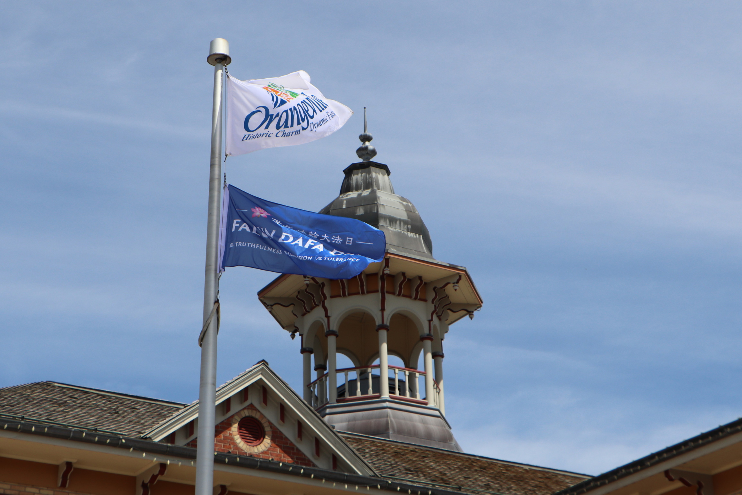 同日的中午十二点,奥兰治维尔市(Orangeville)由市长亲自主持升旗仪式,这是奥兰治维尔市连续第四年用升旗的方式庆祝世界法轮大法日。
