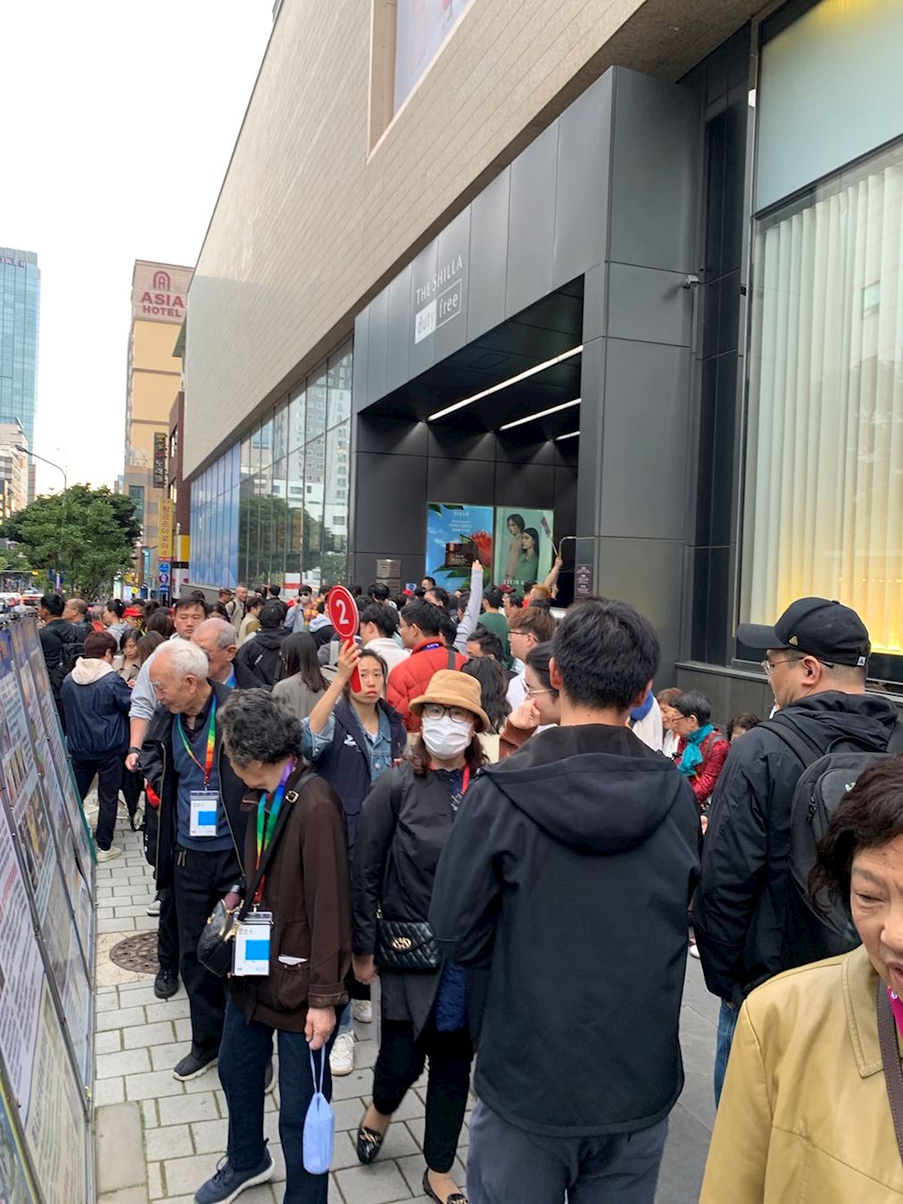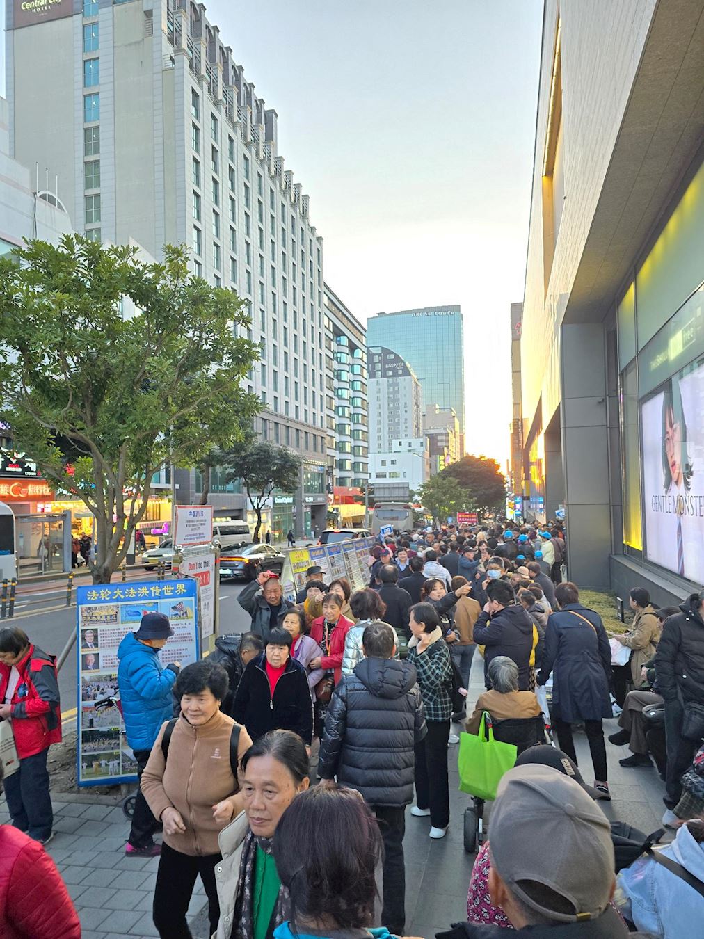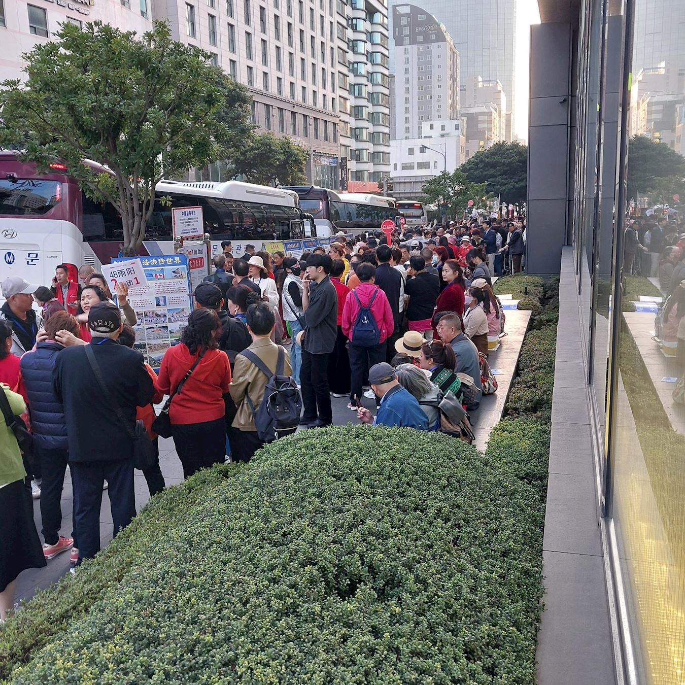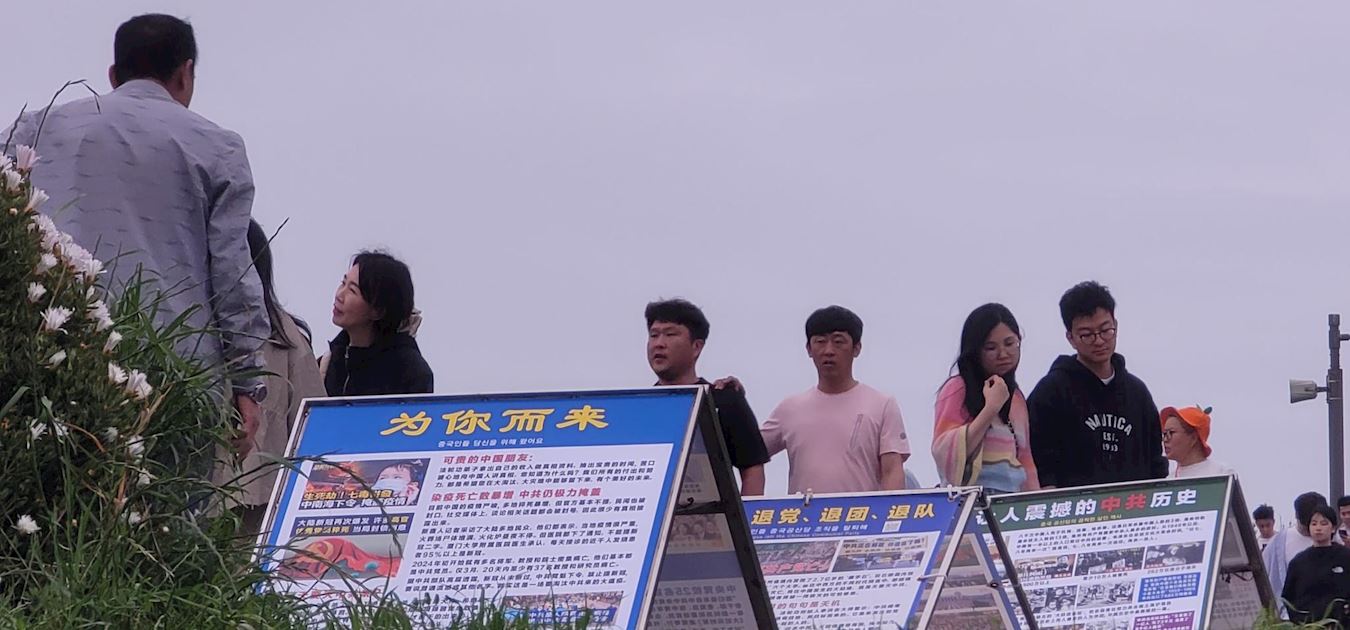 图1~5:在济州岛新罗免税店真相展板前的中国游客,看到法轮功真相展板后他们震惊与意外,面对如此众多的中国游客,急缺讲中国话的同修讲真相,不说中国话的同修举展板、发资料、发正念也好啊。