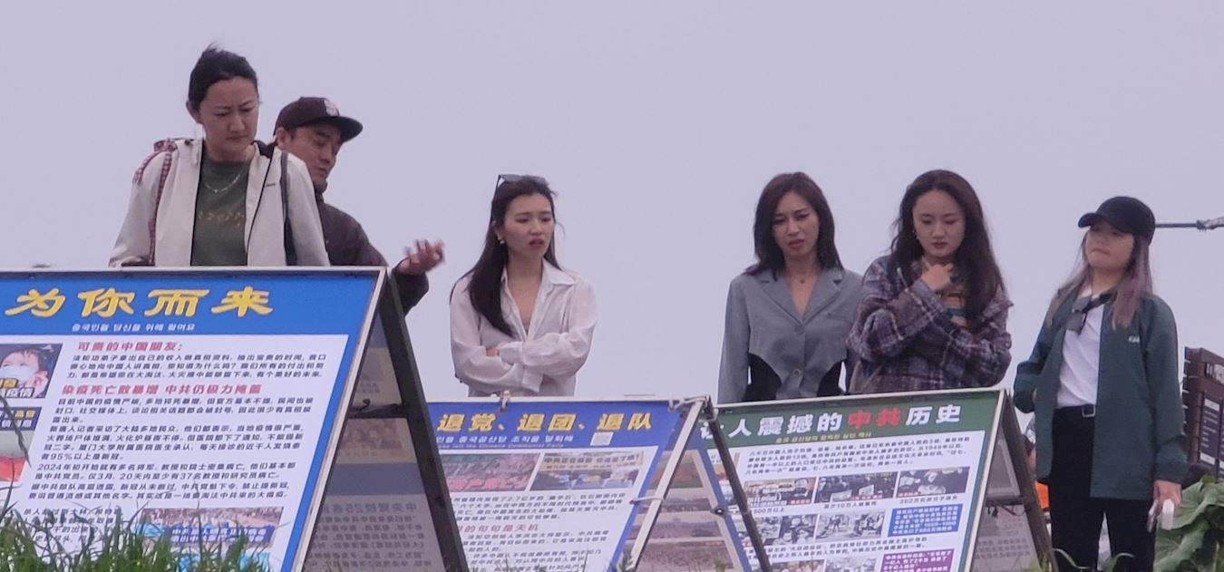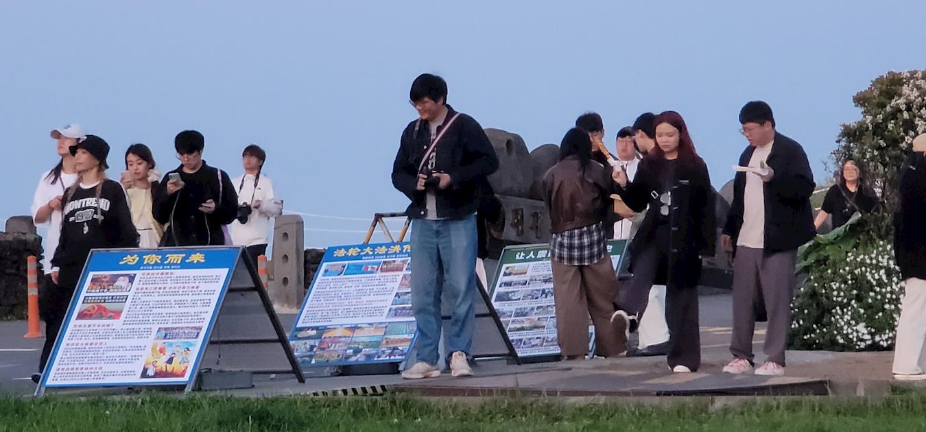 '图1~5:在济州岛新罗免税店真相展板前的中国游客,看到法轮功真相展板后他们震惊与意外,面对如此众多的中国游客,急缺讲中国话的同修讲真相,不说中国话的同修举展板、发资料、发正念也好啊。'