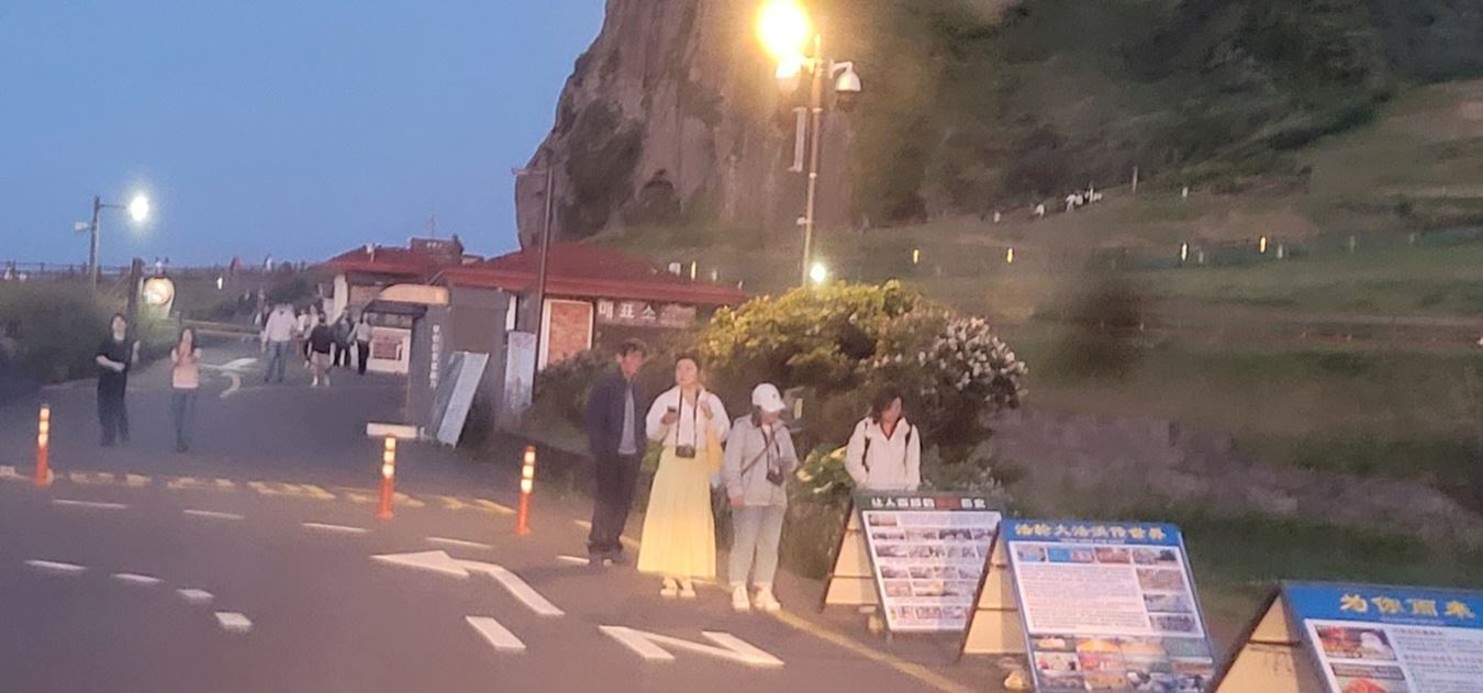 可敬的同修,济州岛是毗邻中国大陆的旅游胜地,因为实行免签政策和旅游费用低等原因,中国大陆游客蜂拥而至,现在更是海量聚集。他们乘飞机或邮轮来济州,邮轮是从中国大陆直达济州岛旅游的,有时一艘邮轮的游客多达五千多人,多时一天两艘邮轮,光邮轮来的中国游客就一万多,这还不算从中国大陆直飞济州岛的航班,目前的航班数也在不断增加。因此现在每天都有大量的中国人来到济州岛。