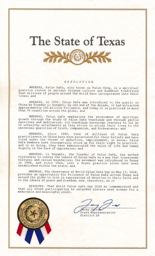 鉴于,二零二四年五月十三日是世界法轮大法日,来自德克萨斯州和全世界的法轮功修炼者将共襄盛举,表达他们对信仰、和平与自由的奉献;