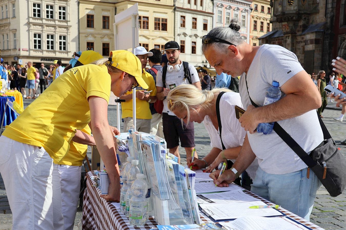 游行结束后,队伍回到老城广场。在法轮大法真相展板前,很多学员在此解答路人的提问,并向民众征签,吁请捷克国会,采取更多行动,共同制止迫害。