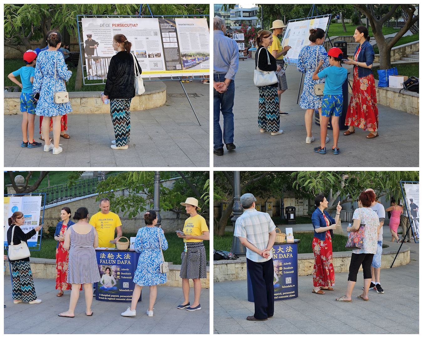 图4~5:二零二四年六月十六日,民众在康斯坦察的法轮功展位阅读真相资料,与学员交谈,并在制止迫害的请愿书上签名。
