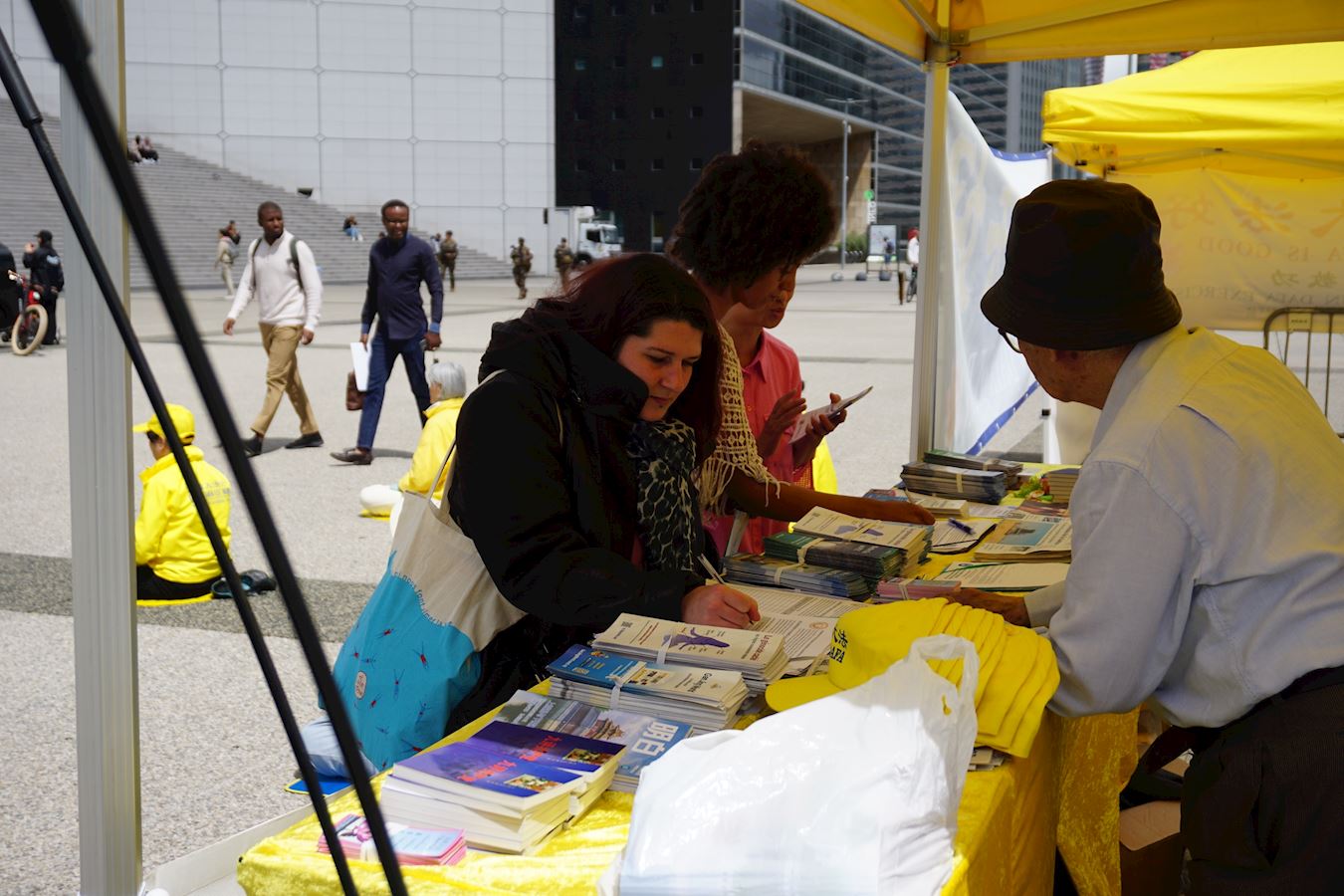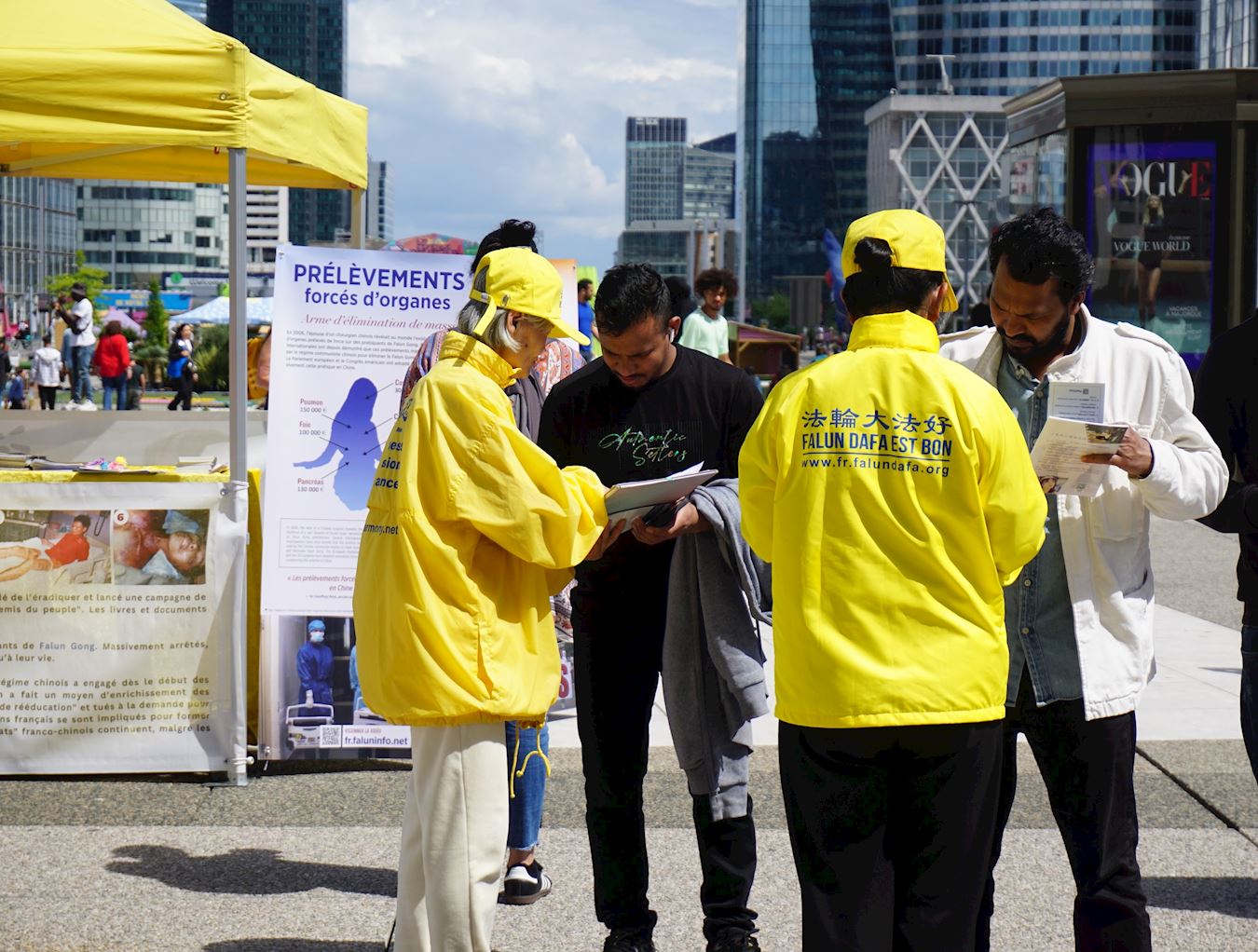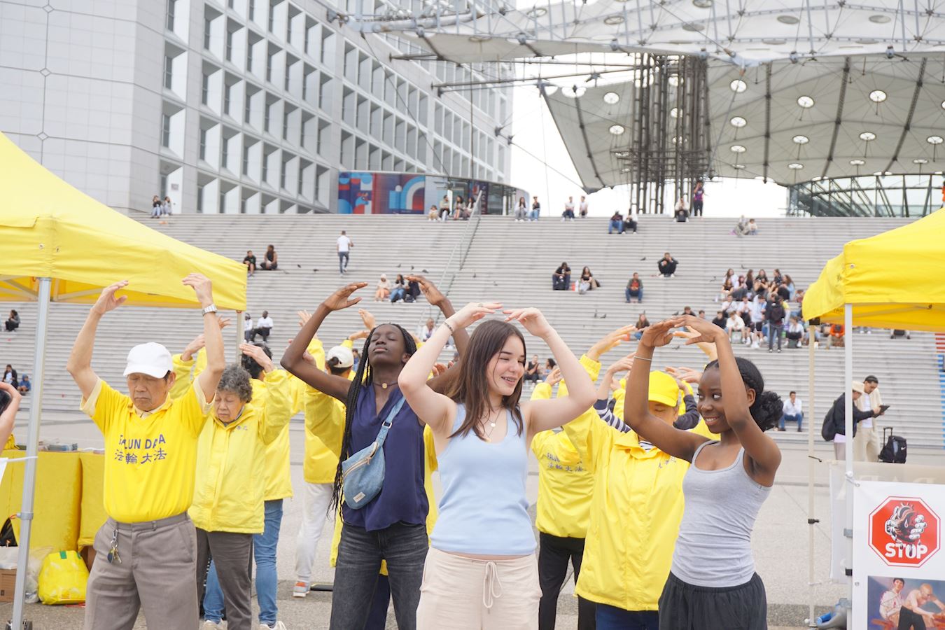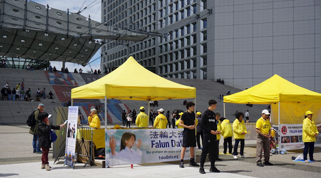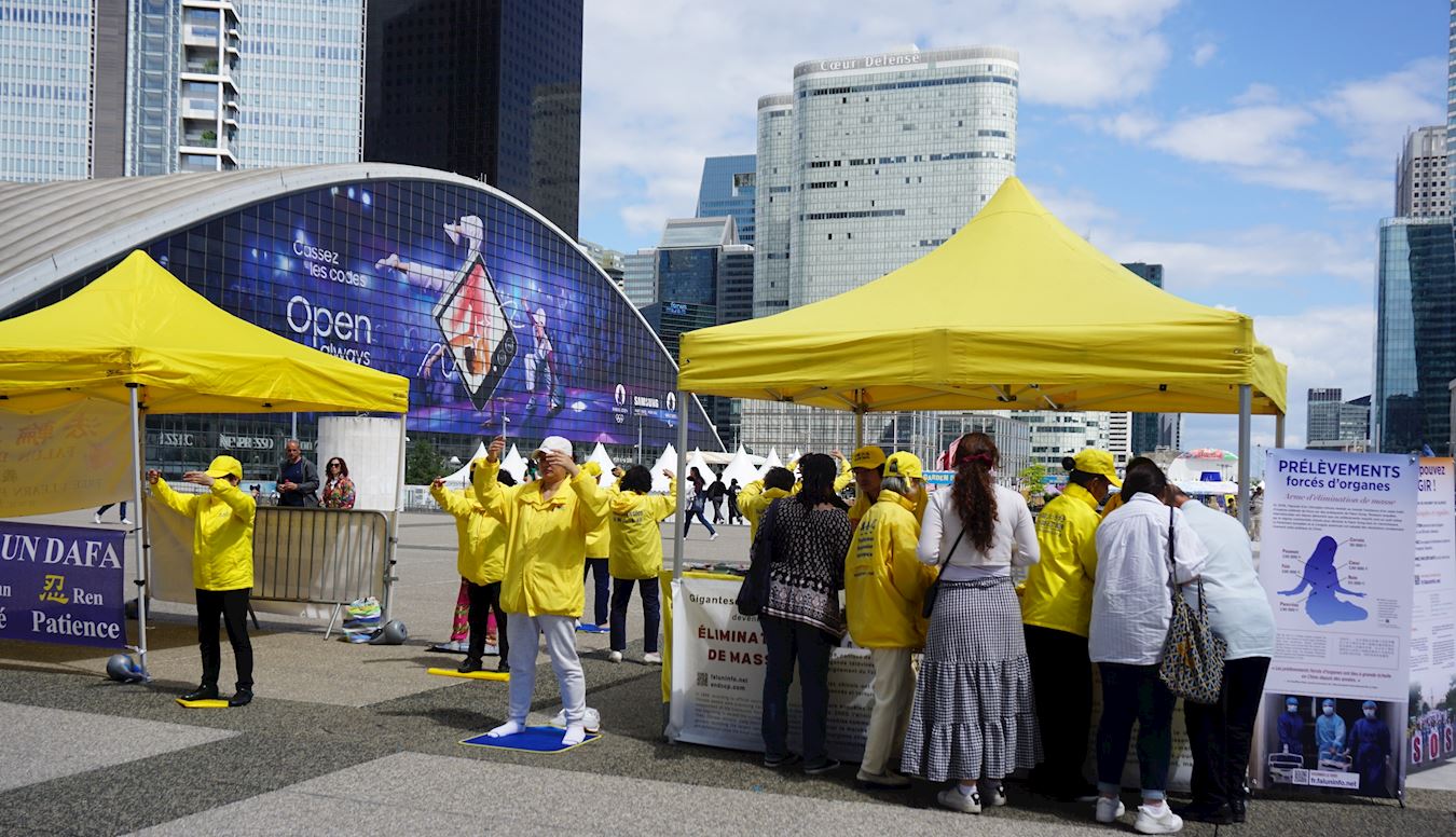 二零二四年六月二日从上午十点到下午六点,他们在巴黎著名的科技园区拉德芳斯(La Défense)设立了展位,向人们展示了法轮功优美祥和的五套功法。同时,也揭露了中共如何使用非法、非人道手段迫害法轮功学员。了解了真相的人们纷纷来到展位了解真相,并签名支持反迫害。有很多民众因喜爱优美的功法,当即就开始学炼功法。