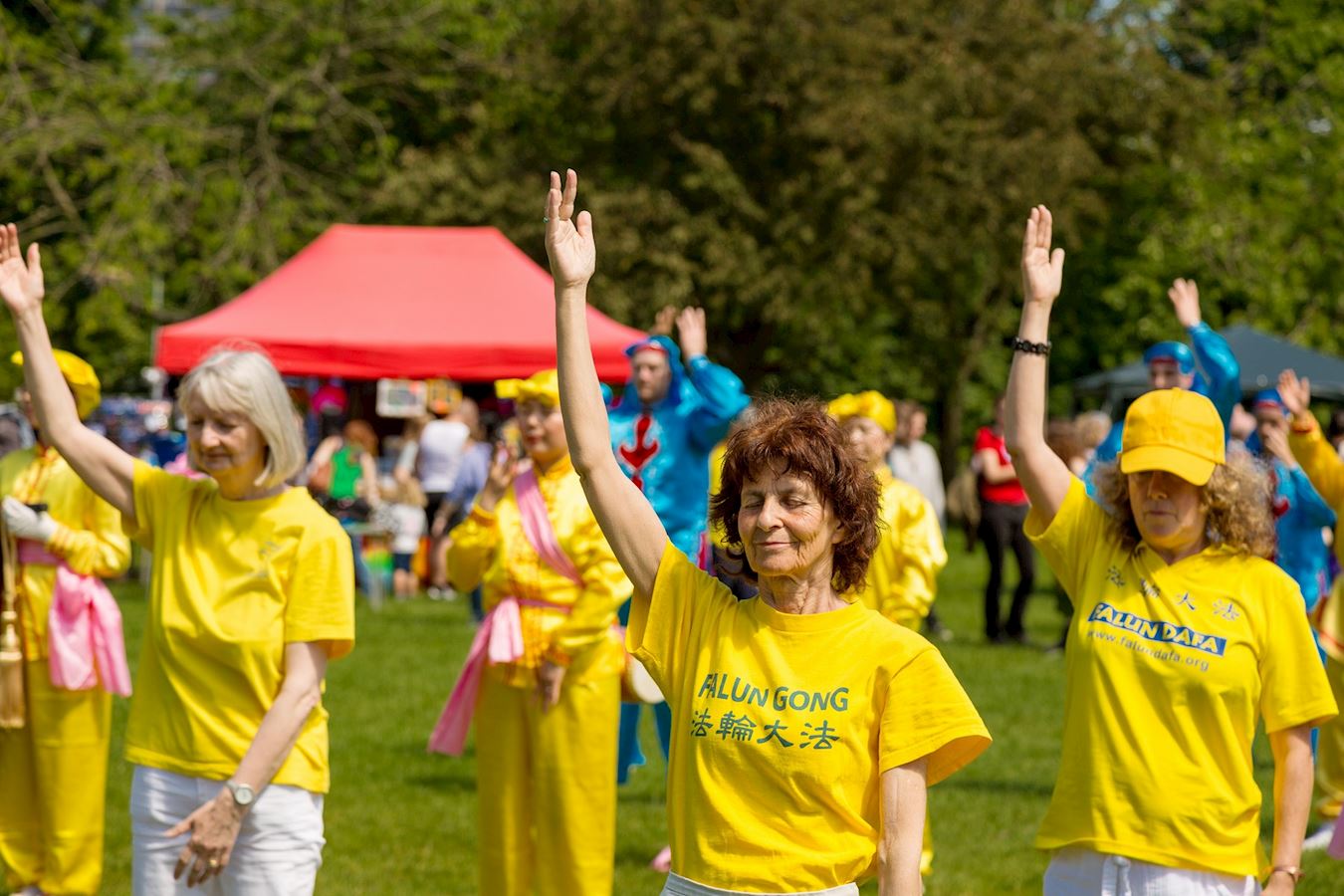 今年,主办方除分配给学员一个展位外,还邀请学员周六和周日两天,在固定表演区打腰鼓、舞龙、演示法轮功五套祥和的功法,同时也安排学员在艺术节上环场行进表演。法轮功是主办方唯一指定可以环场表演的团体。