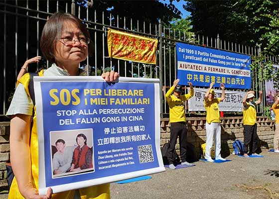- 意大利参议院人权委员会委员:绝不能容忍中共践踏人权- 六月六日,意大利法轮功学员来到中共驻罗马使馆前,抗议中共非法抓捕、关押意大利法轮功学员赵李力女士在中国大陆修炼法轮功的亲人。