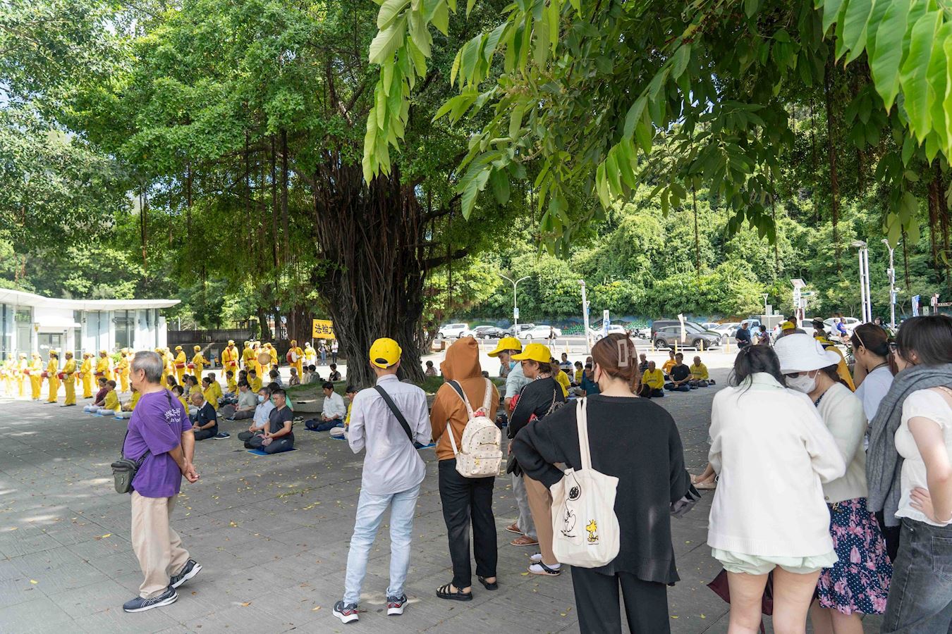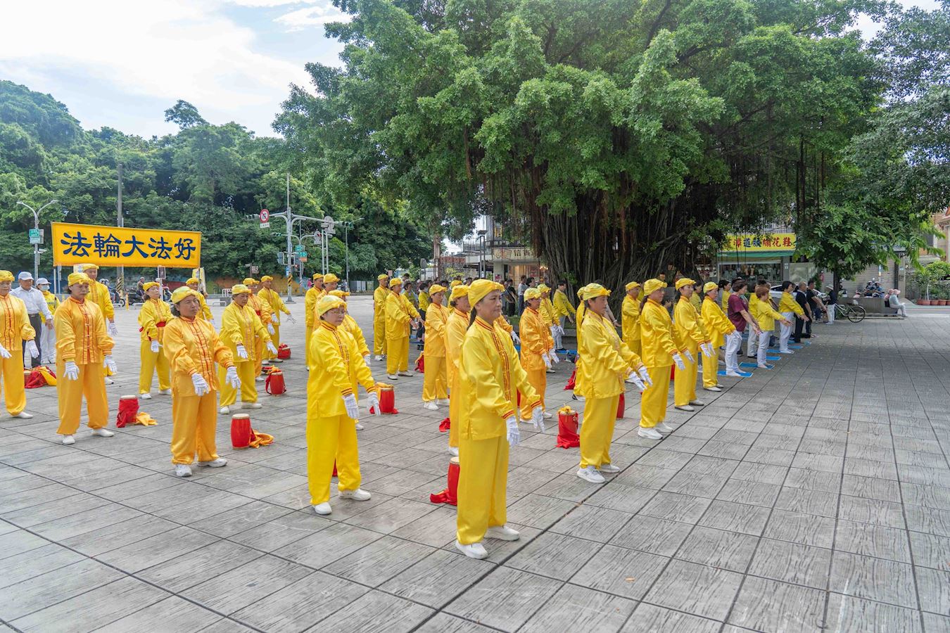 图1~4:二零二四年七月七日下午,高雄部分法轮功学员来到莲池潭景点弘法传真相,活动包括腰鼓队表演和五套功法演示,祥和的炼功场面吸引不少民众驻足观看。