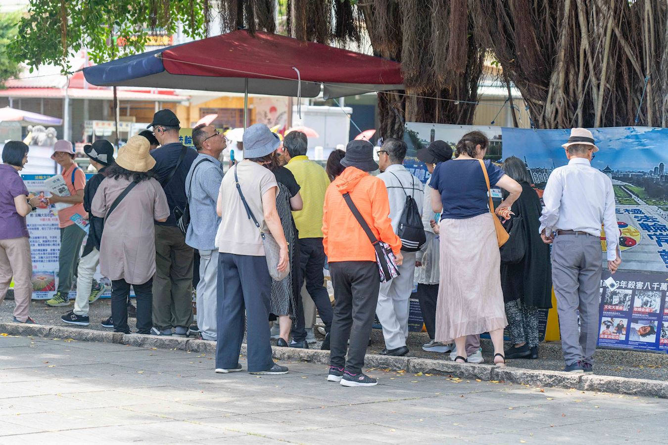 '图8~9:日本游客在台湾领队的带领下,观看真相展板,了解法轮功的真相。'