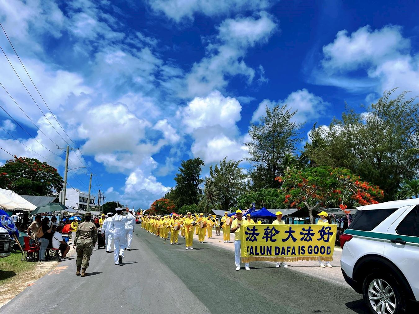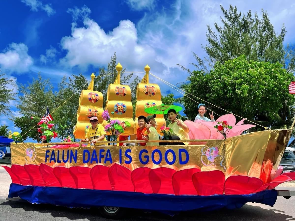 塞班岛法轮功学员应邀参加了此次游行,同时当地佛学会荣幸邀请到了台湾法轮大法腰鼓队前往塞班,他们将大法的光明美好带给塞班市民。上午十时,一架飞机从天空飞过,游行在喜庆的氛围中拉开帷幕,法轮功学员的游行方阵由拉横幅队、腰鼓队和精美法船三部分组成,队伍色彩亮丽,鼓乐齐鸣吸引观众目光。法轮功学员们精神饱满,平和乐观,法轮功横幅队学员手持中英文横幅“法轮大法好”,“世界需要真善忍”、“了解真相是得救的希望”等横幅,向人们传播着大法的福音,赢得观众喜爱和尊重。