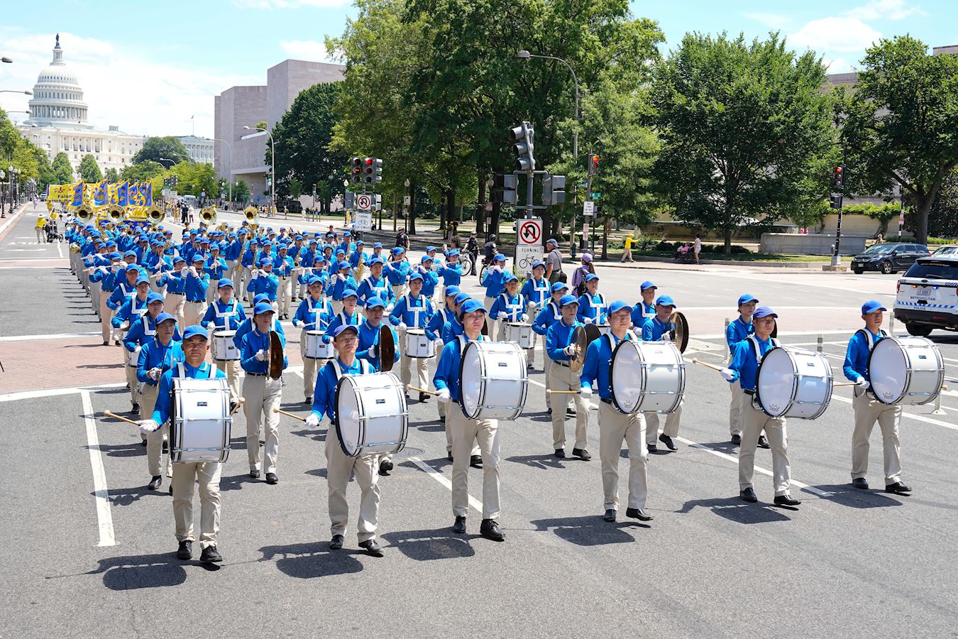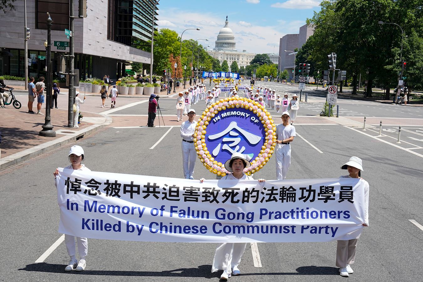 队伍分为三个方阵。第一方阵展现法轮大法好,由天国乐团引领,然后是彩旗队,手持“法轮大法好”横幅的法轮功学员紧随其后。第二方阵呼吁停止迫害法轮功。数十位法轮功学员身穿白衣白裤,表情肃穆,手捧被中共迫害致死的中国大陆法轮功学员的照片。第三方阵主题是解体中共,声援四亿三千多万中国民众退出中共和相关组织。