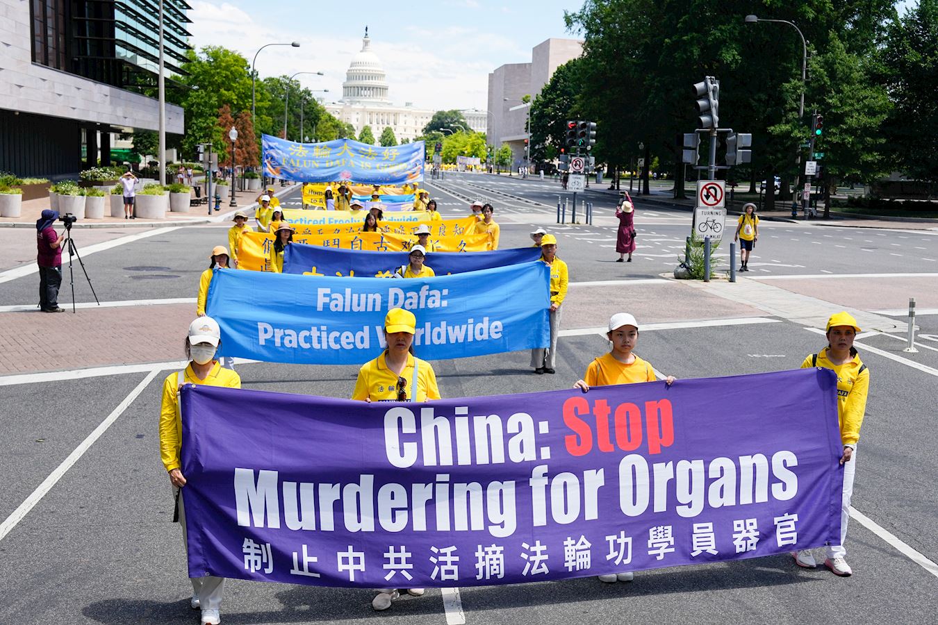 在华盛顿DC工作的艾琳(Erin)用手机拍下了一个个横幅。艾琳说,在过去十年里,她至少看过六次法轮功学员的游行。她说:“(游行)非常震撼,庄严宏大。”