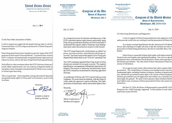 七月十二日,美国乔治亚州国会议员桑福德·D·毕晓普致信亚特兰大佛学会,表达他对法轮功学员的勇气和和平反迫害的坚韧意志的赞赏。
