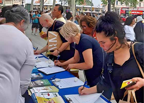 七月六日,法轮功学员在巴塞罗那市中心的加泰罗尼亚广场举办反迫害征签活动。当了解法轮功真相后,各国游客以及当地居民纷纷前来签名声援。