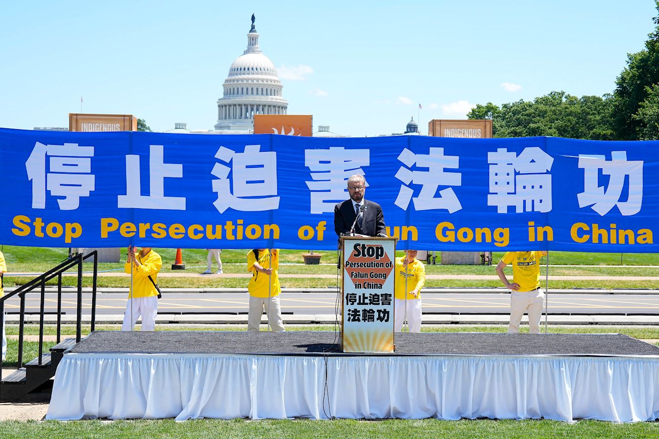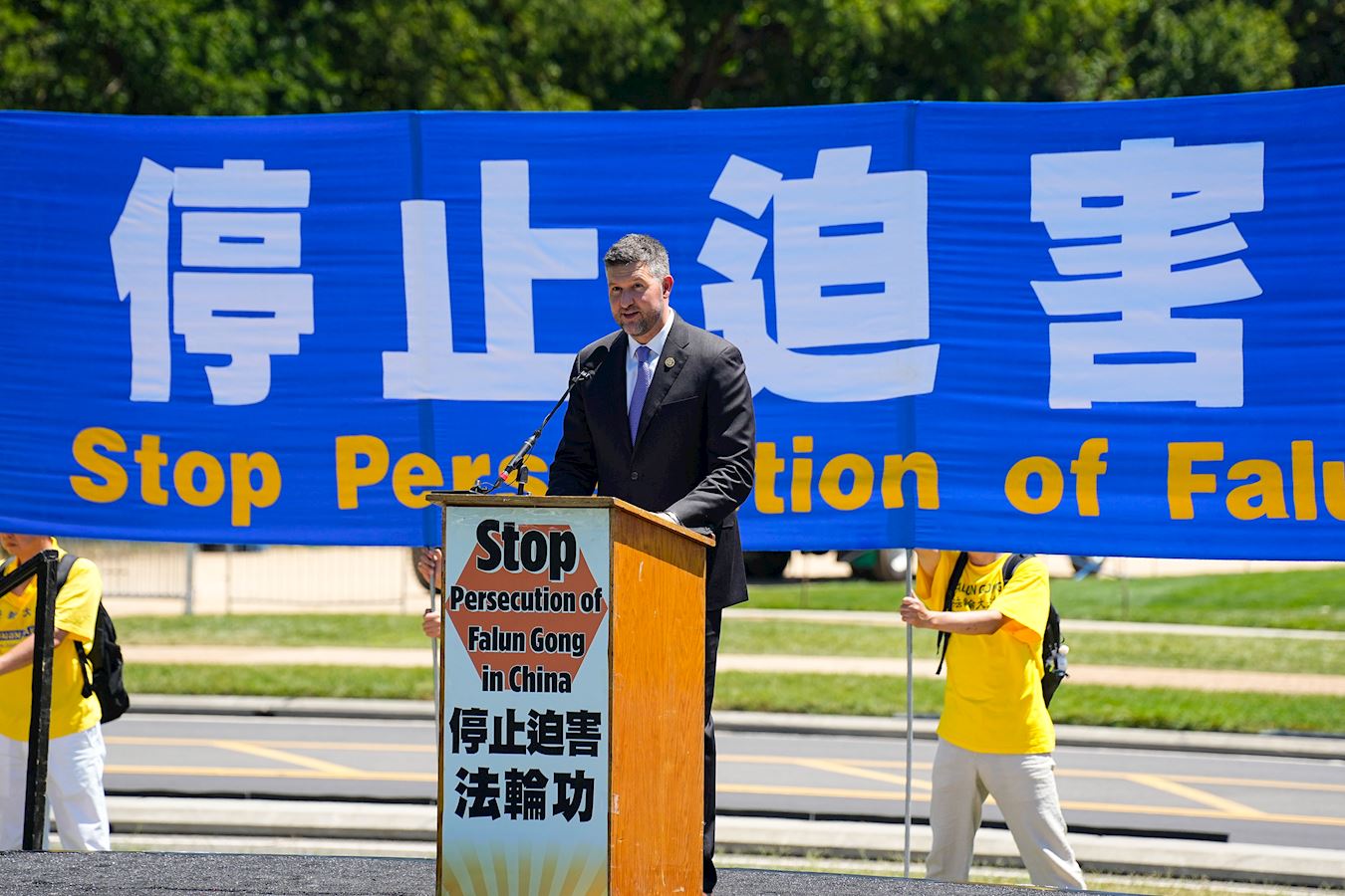 美国国会及行政当局中国委员会(Congressional-Executive Commission on China,简称CECC)幕僚长皮耶罗·托齐(Piero Tozzi)来到法轮功学员反迫害集会现场,代表美国国会及行政当局中国委员会(CECC)主席、新泽西州联邦众议员克里斯·史密斯(Chris Smith)和美国国会及行政当局中国委员会共同主席、俄勒冈州联邦参议员杰夫·默克利(Jeff Merkley)以及委员们,在集会上发言。