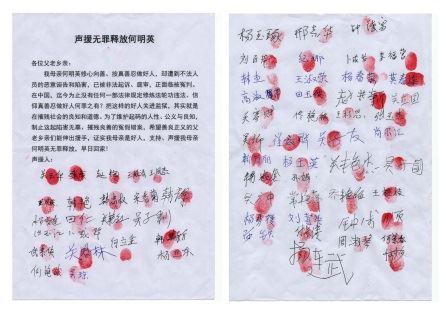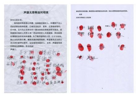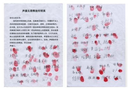 以下是何明英的家人的呼吁信及乡亲们的声援签名: