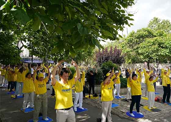 七月十三日,法国巴黎部分法轮功学员在反迫害二十五年之际,在中国驻法国大使馆附近的广场集会,向民众展示法轮功五套功法和真善忍理念。