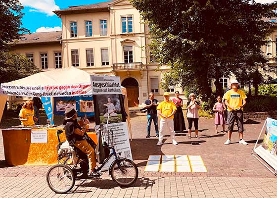 法轮功学员在旅游胜地海德堡讲真相。向路人弘法、征签反迫害,展示法轮功真善忍理念,揭露中共残酷迫害以及活摘法轮功学员器官的罪恶。