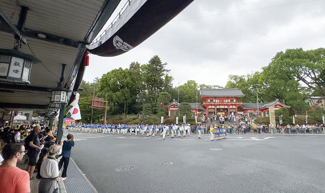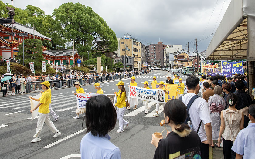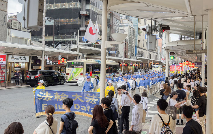 下午三点,游行队伍由威武雄壮的天国乐团打头阵,从京都御池大桥浩浩荡荡出发,途径八坂神社、圆山公园、祇园街等观光胜地。在有信仰文化底蕴的京都,市民们停下脚步仔细观看横幅传递的信息,有的人还情不自禁的念出声音来。特别是“世界需要真善忍”的理念得到了很多人的赞赏。