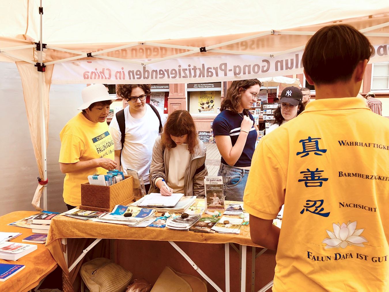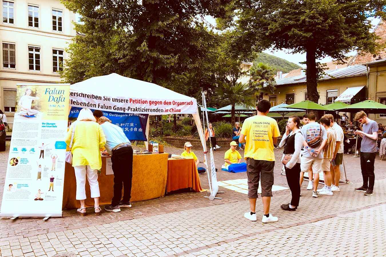【明慧网二零二四年七月十七日】“七·二零”即将来临之际,德国莱茵-内卡地区法轮功学员于二零二四年七月十三日在著名旅游胜地海德堡(Heidelberg)老城主街(Hauptstrasse)举办讲真相活动。向路人弘法、征签反迫害,展示法轮功真、善、忍理念,揭露中共残酷迫害以及活摘法轮功学员器官的罪恶。