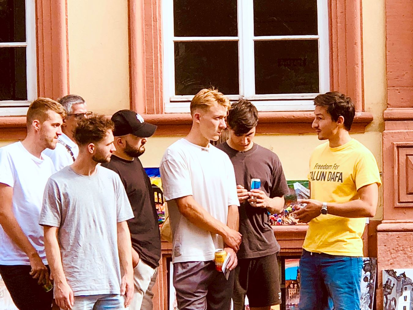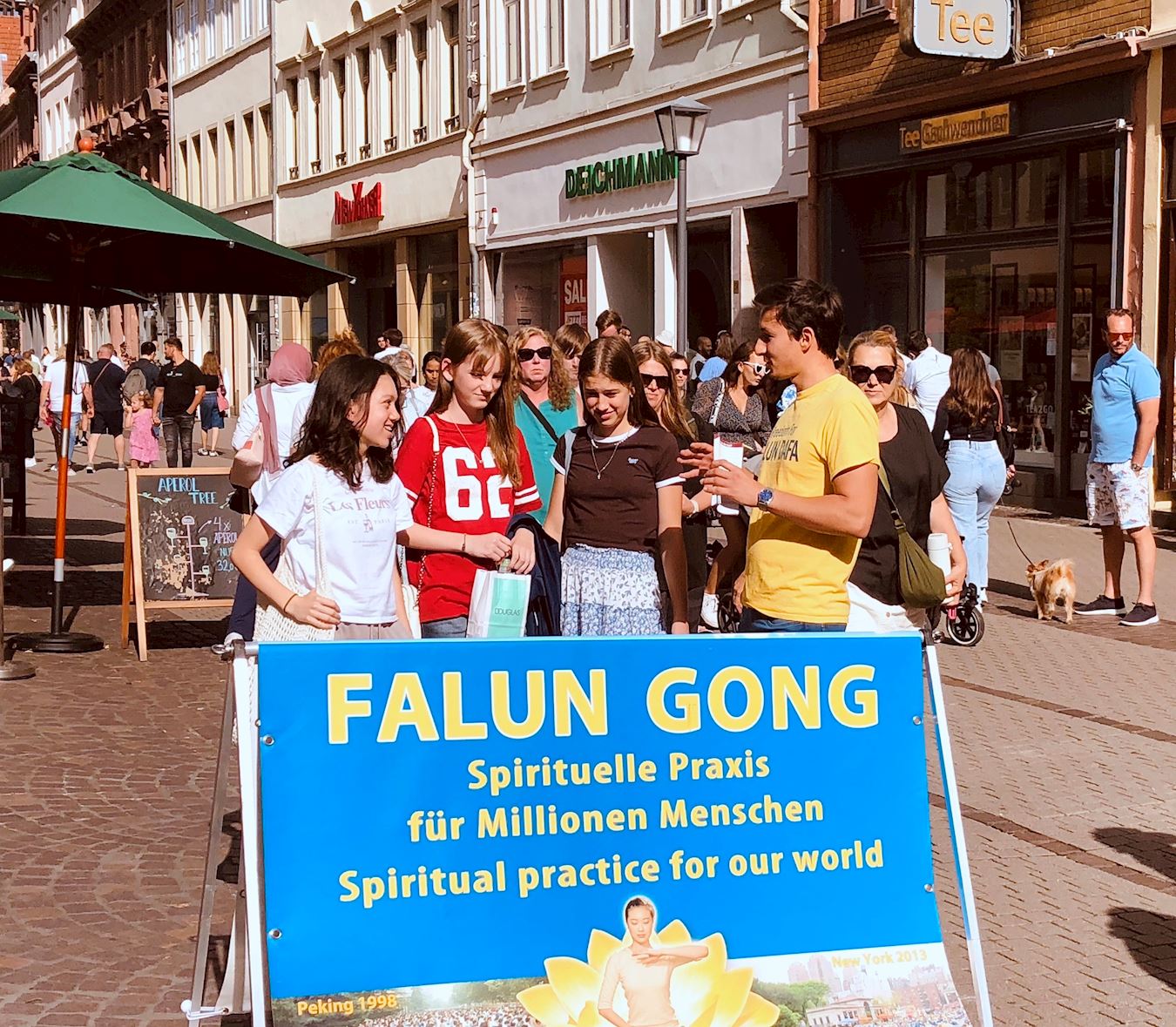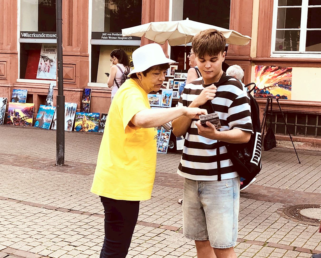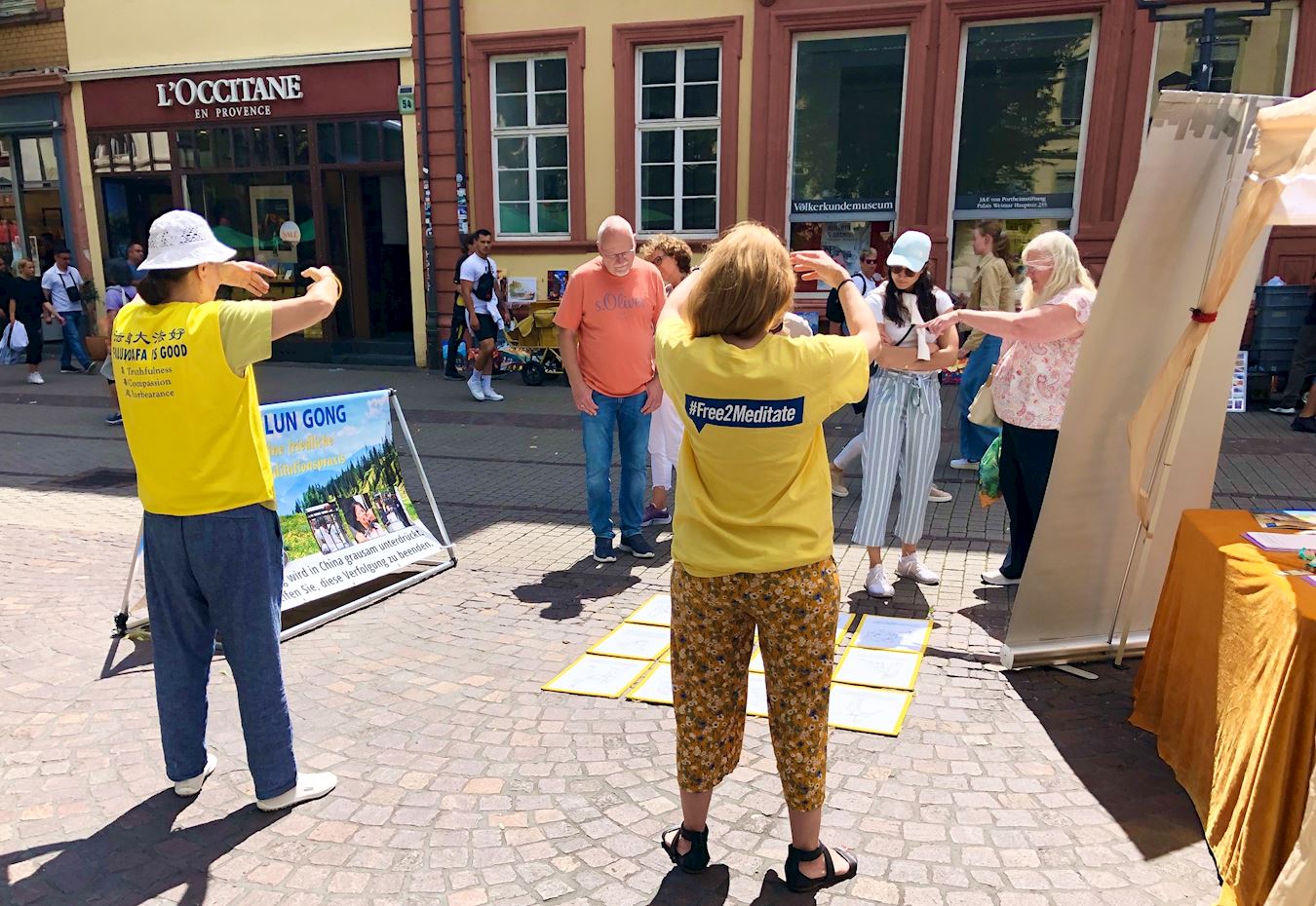 图1:二零二四年七月十三日,德国莱茵-内卡地区法轮功学员在著名旅游名城海德堡(Heidelberg)举办纪念反迫害二十五周年的活动。图为法轮功学员向路人展示功法。