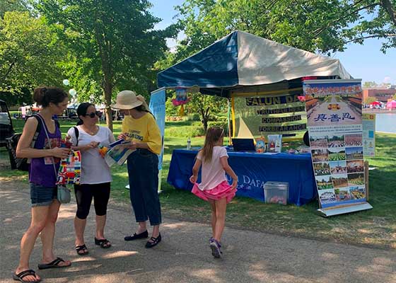 法轮功学员七月十三日参加了芝加哥西郊的国际文化节,向当地居民和游客介绍法轮大法。很多人在现场就立刻学炼法轮功功法。
