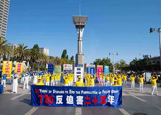 七月二十日,在中共迫害法轮功25年之际,美国旧金山湾区的法轮功学员举行集会和盛大游行等活动,谴责中共对法轮功的迫害,要求停止迫害。