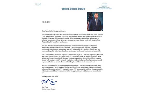 在中共迫害法轮功25年之际,美国联邦参议员泰德·克鲁兹致信说:“我坚定的谴责中共对法轮功修炼者的迫害,我很自豪能与你们站在一起。”