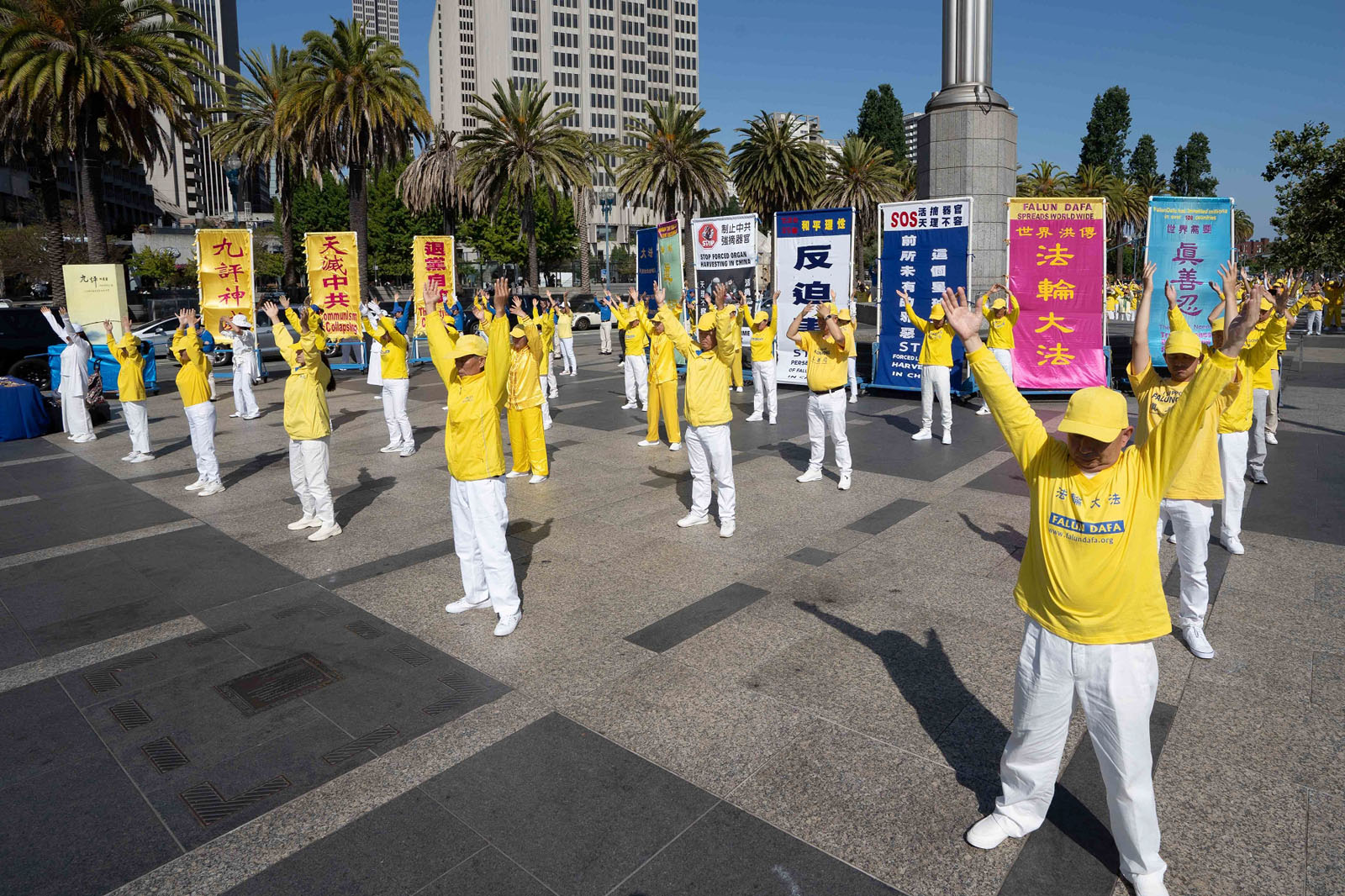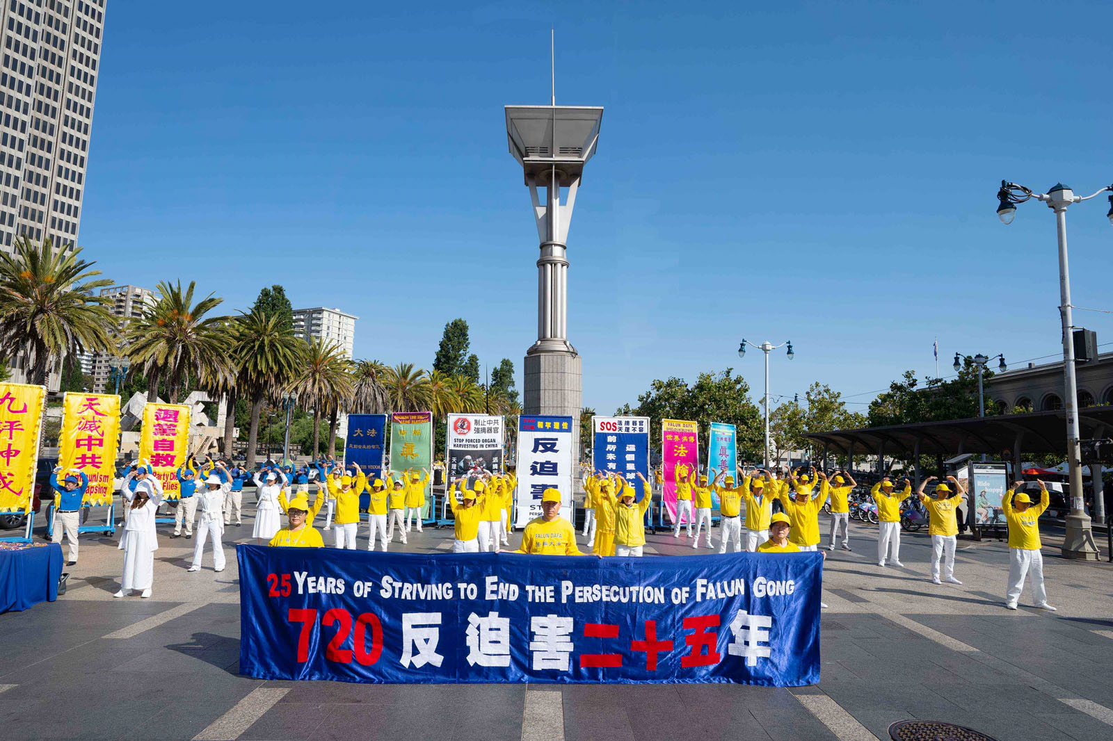 上午八点,法轮功学员首先在旧金山渡轮大厦(Ferry Building)前集体炼功,展示祥和优美的功法。许多游客被吸引,了解什么是法轮功。还有的人看到这么祥和的炼功场面,学炼法轮功。