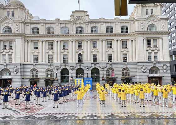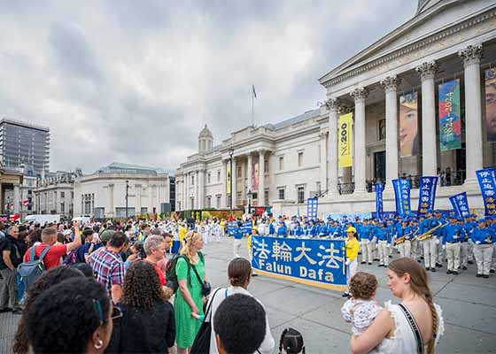 七月二十日,来自英国各地的法轮功学员在伦敦市中心举行游行集会,揭露中共对法轮功长达25年的残酷迫害。