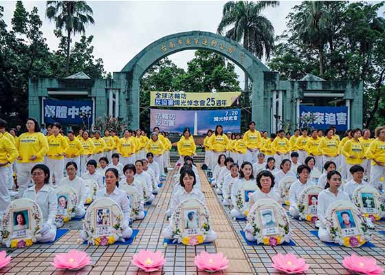 七月二十日下午,台湾中部部分法轮功学员聚集在台中市文心森林公园举办反迫害二十五周年集会,悼念遭受中共迫害致死的法轮功学员。