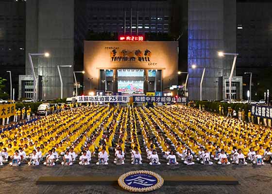 七月二十日晚间,来自台湾北部法轮功学员,在落日余晖下齐聚台北市政府广场,悼念因信仰真、善、忍而被迫害致死的学员。台湾议员和律师也共同谴责中共的暴力罪行。