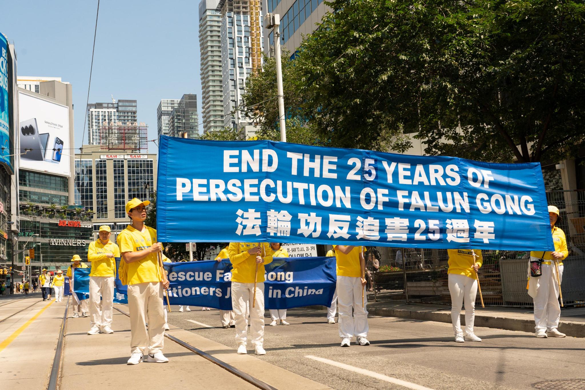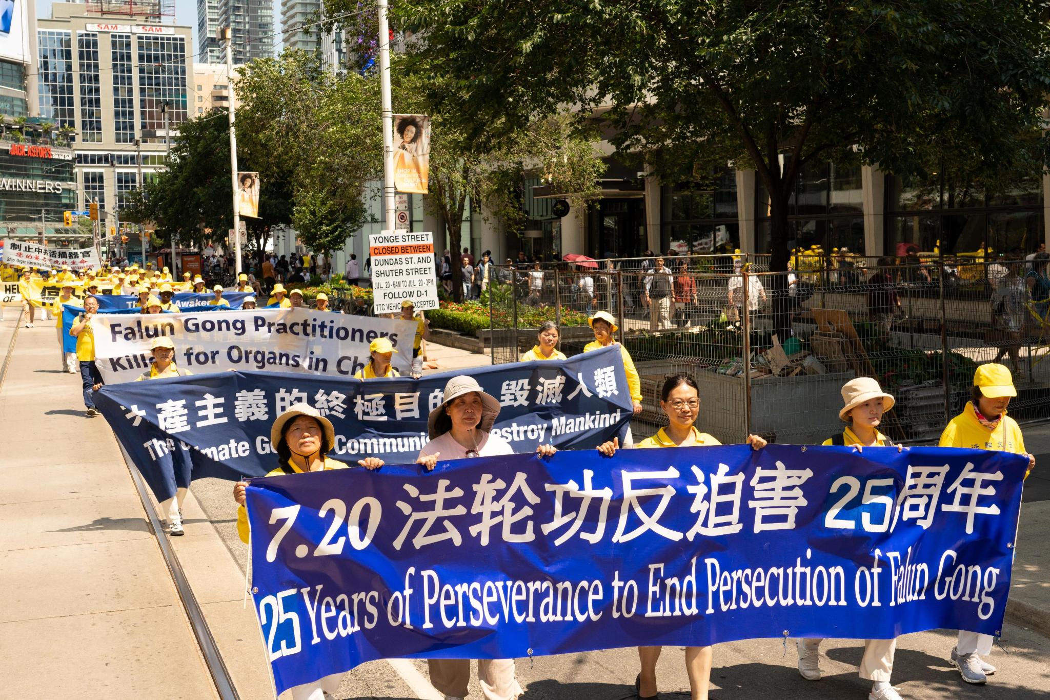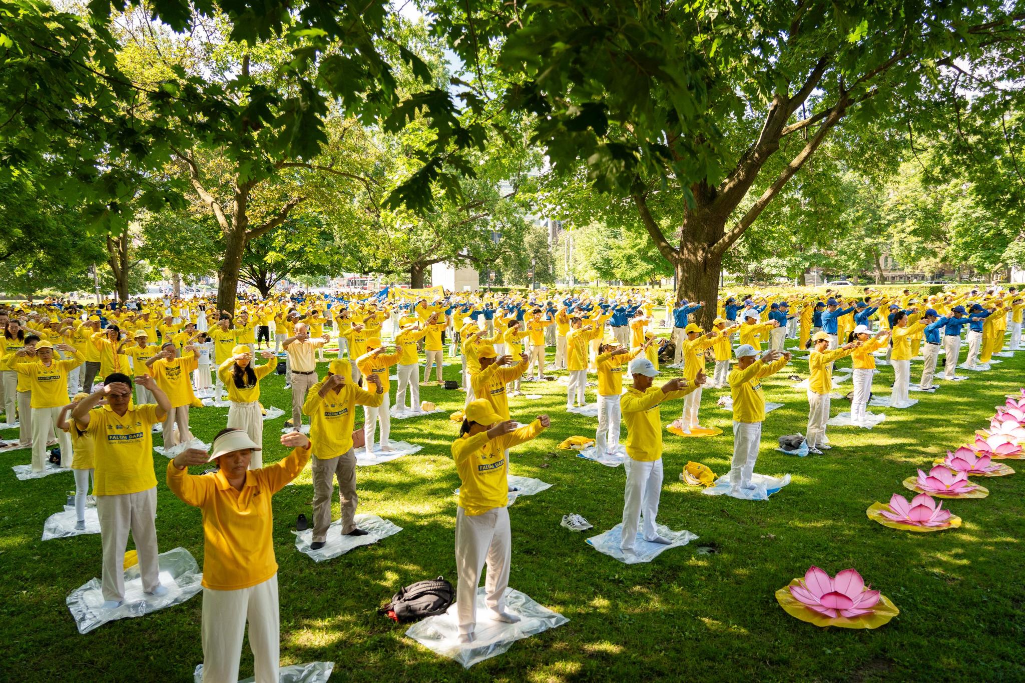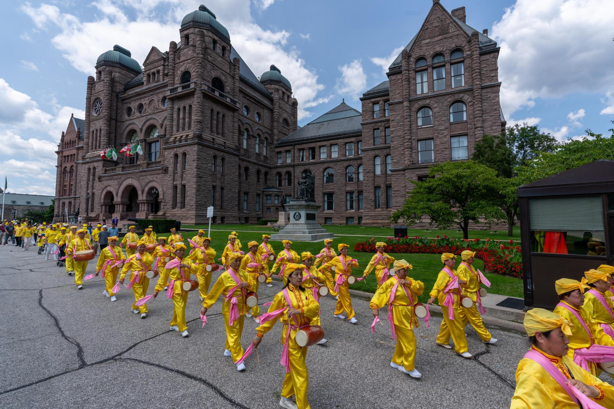 清晨,学员们在皇后公园(Queen’s Park)的草坪上集体炼功,场面盛大而宁静,吸引了游人驻足观看、了解、学炼。中午时分,学员们在省议会大楼前举办集会,呼吁人们关注法轮功学员所经历的迫害,制止中共的暴行。下午,学员们组成浩大的游行队伍,从省议会大楼出发,走过市中心的主要街道,用横幅与音乐传递大法的真相与美好。市民们被游行的盛况所震撼,纷纷挥手、拍照、录像,并接过传单了解真相。当晚,学员们在中国领事馆前静坐,他们手捧花圈,表情肃穆,悼念过去二十五年间因坚守信仰而被中共剥夺生命的法轮功学员。