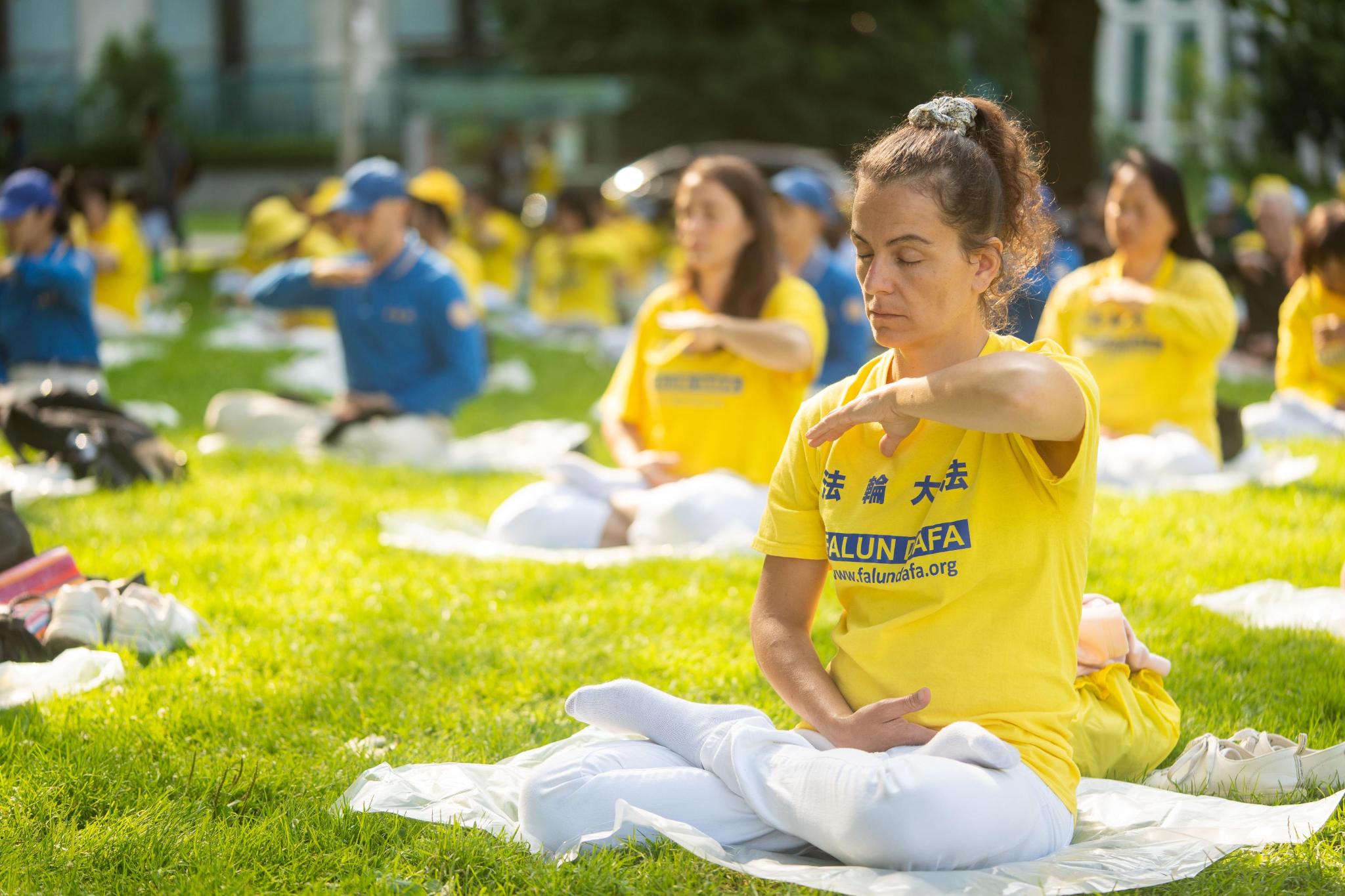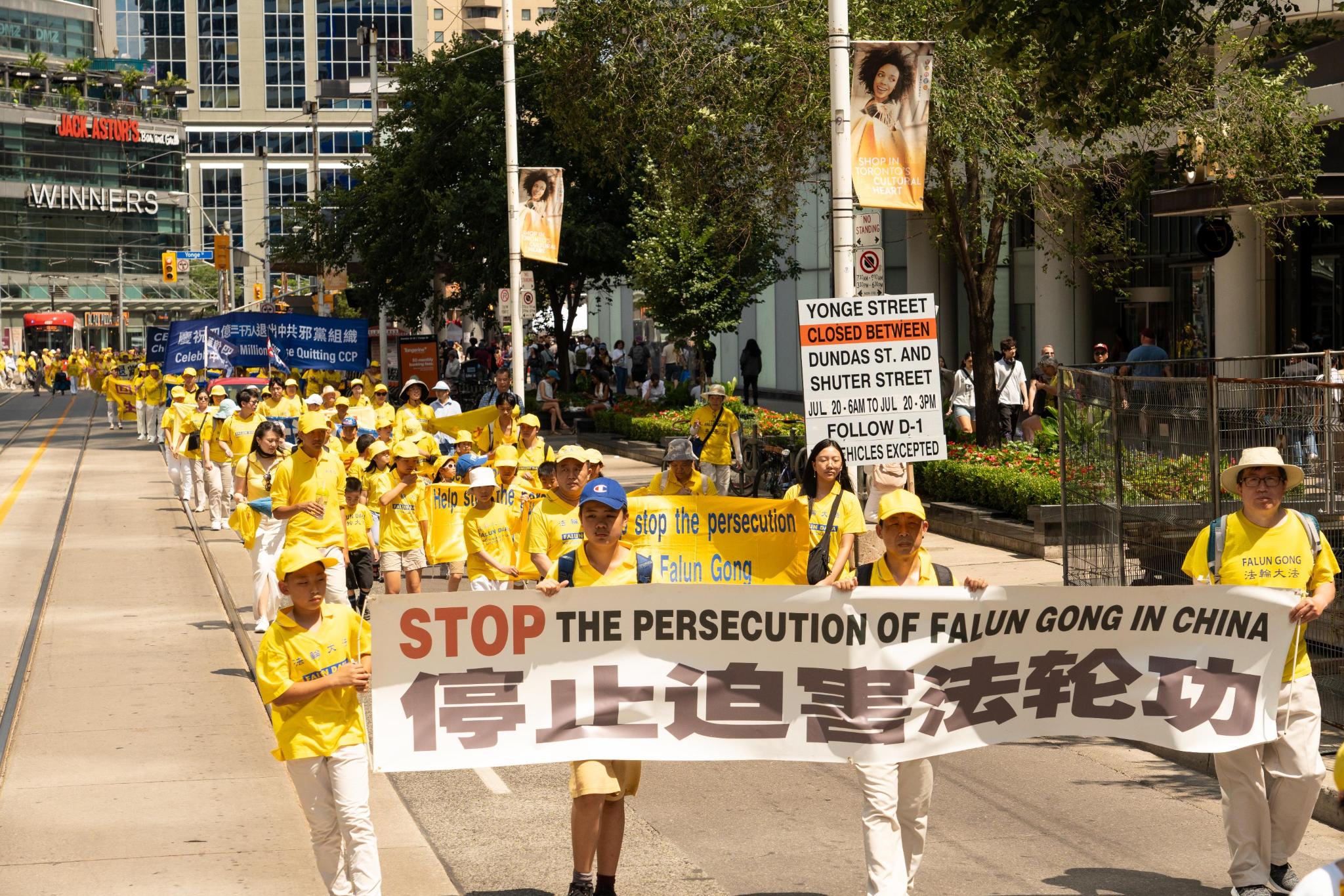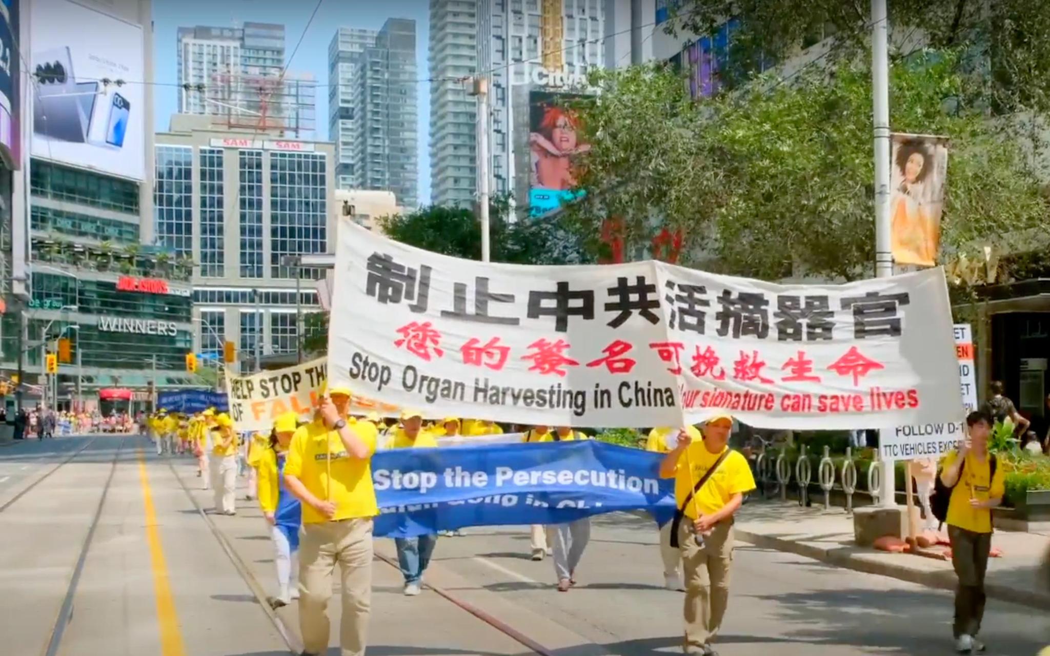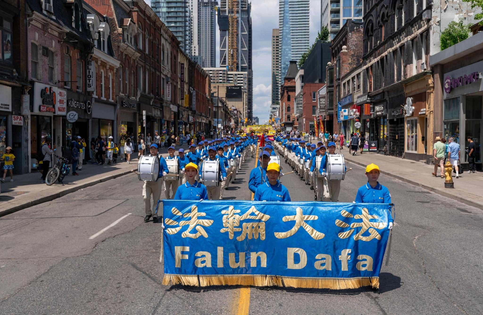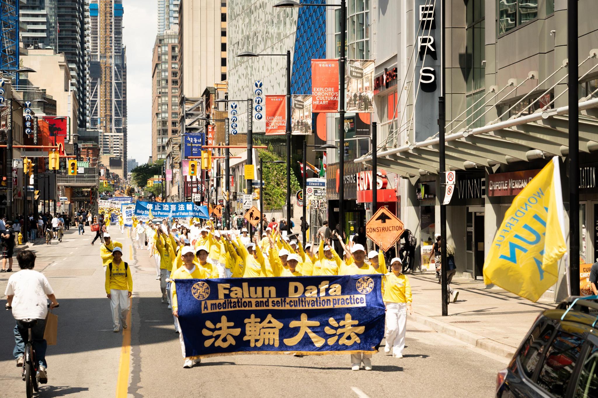 清晨,学员们在皇后公园(Queen’s Park)的草坪上集体炼功,场面盛大而宁静,吸引了游人驻足观看、了解、学炼。中午时分,学员们在省议会大楼前举办集会,呼吁人们关注法轮功学员所经历的迫害,制止中共的暴行。下午,学员们组成浩大的游行队伍,从省议会大楼出发,走过市中心的主要街道,用横幅与音乐传递大法的真相与美好。市民们被游行的盛况所震撼,纷纷挥手、拍照、录像,并接过传单了解真相。当晚,学员们在中国领事馆前静坐,他们手捧花圈,表情肃穆,悼念过去二十五年间因坚守信仰而被中共剥夺生命的法轮功学员。