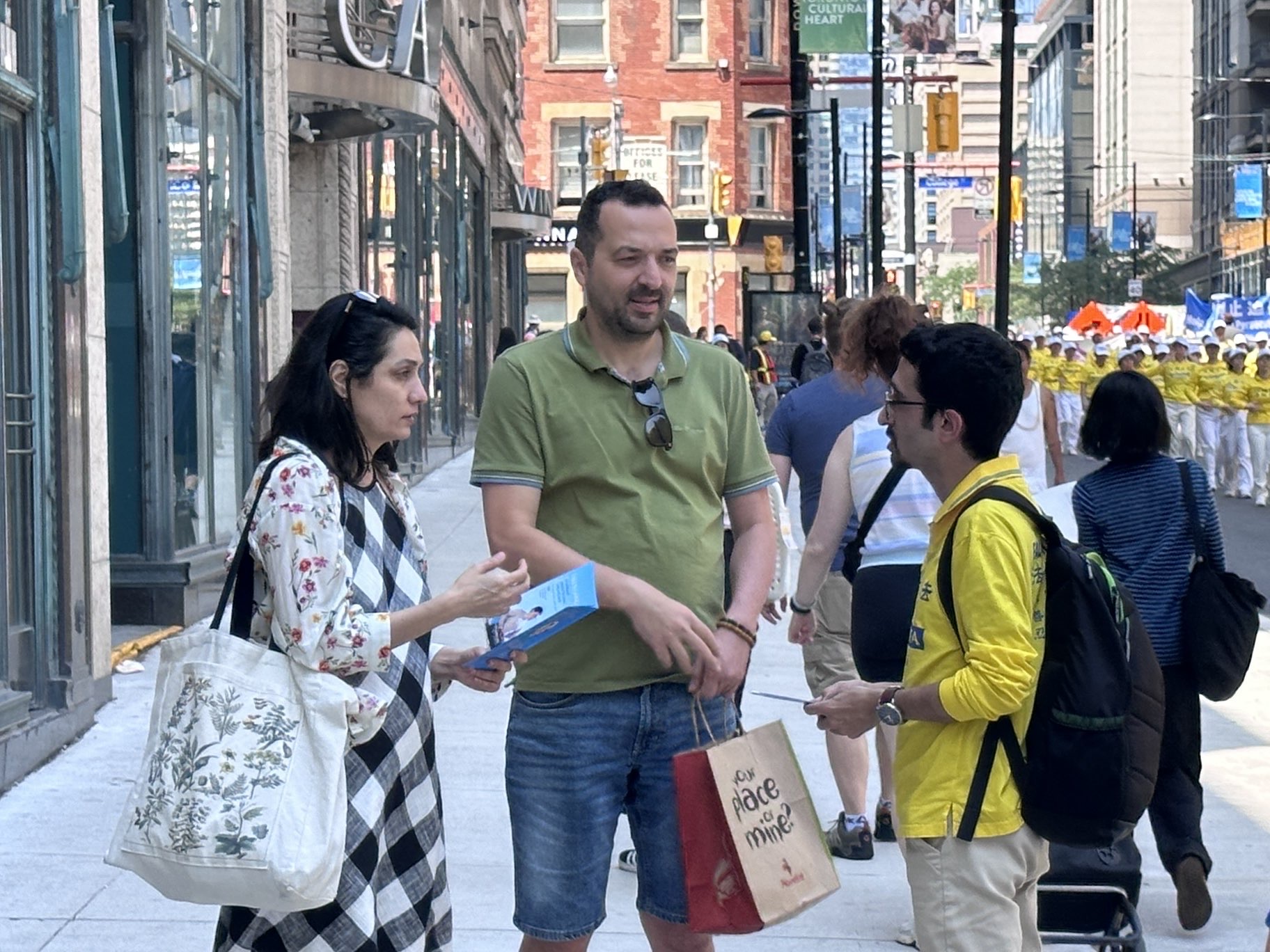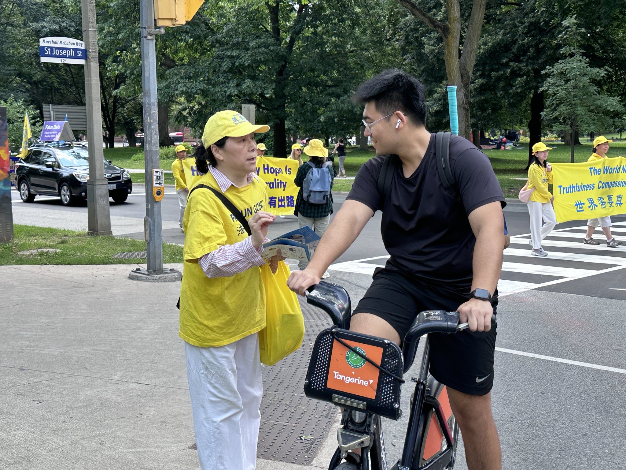 杰玛认为,中国的学员可以在多伦多自由地游行,这与中国大陆形成鲜明对比,“我们很高兴,这些中国人可以自由地生活在加拿大,而不必担心被迫害。”她拿着传单说:“我会去看传单,了解更多。”