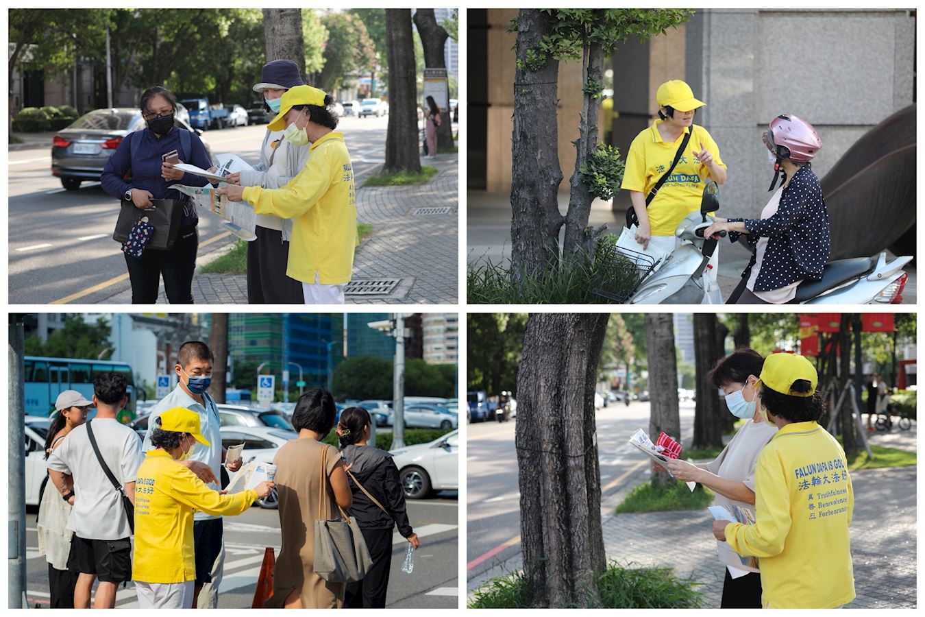 '图15~16: 法轮功学员在集会现场的周边,向过往的行人派发资料、讲述真相。'