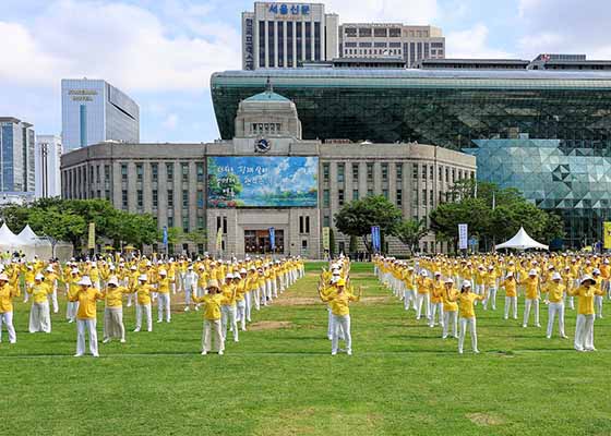 来自韩国全国各地的法轮功学员,七月十六日齐聚首尔市厅广场,举行了反迫害二十五周年集会游行活动。
