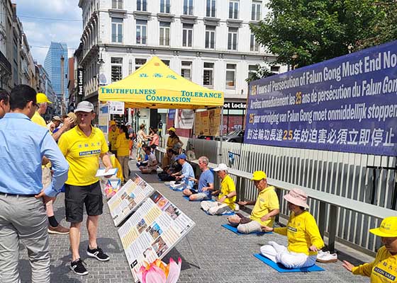 七月二十日,法轮功学员在比利时首都布鲁塞尔商业中心,向民众揭露中共对法轮功长达二十五年迫害的真相,呼吁制止迫害。